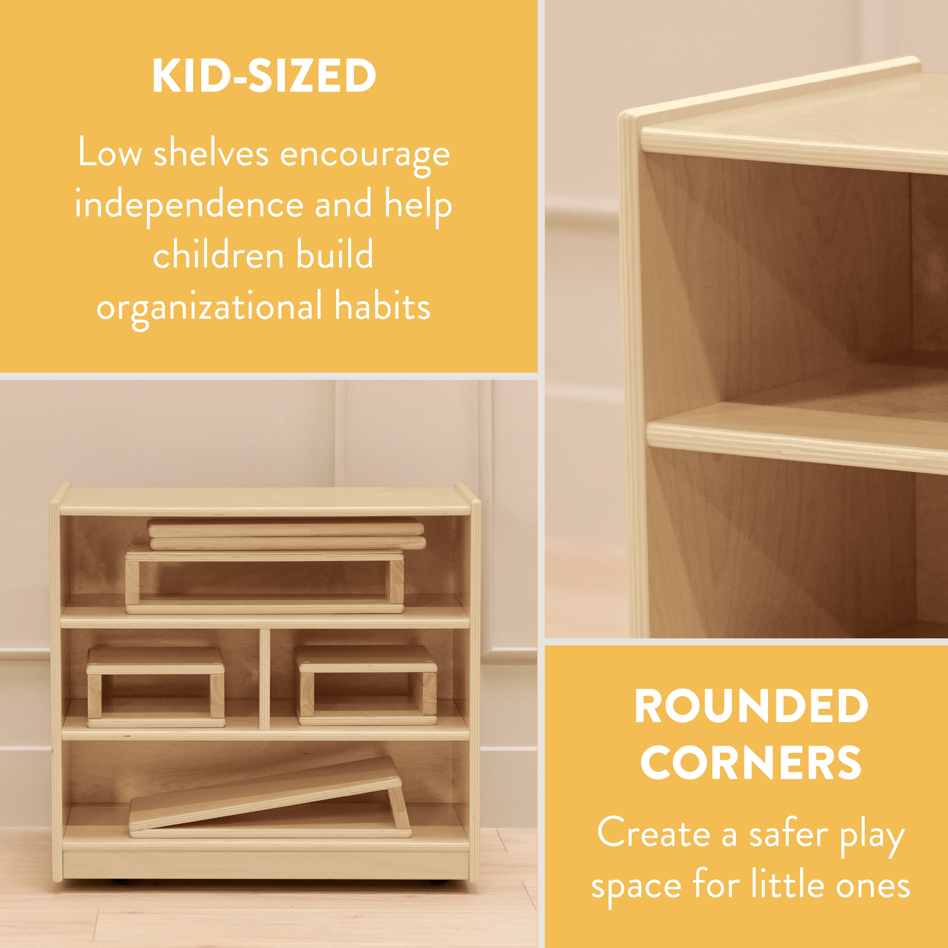 Encourage independence and tidy block play areas with the Back2School Express 4-Compartment Mobile Block Storage Cabinet—designed specifically for organizing building blocks, hollow blocks, and classroom supplies. The starter size of this storage cart features four spacious compartments, perfectly sized to accommodate a variety of block sets, from wooden blocks to classic unit blocks. Whether placed in a playroom, learning center, or preschool classroom, the storage shelf helps children easily access and return their building blocks to designated spaces, supporting hands-on learning and independent clean-up. Use it as a dedicated block shelf or an all-in-one storage organizer for toy storage. Crafted from sustainably sourced birch plywood, this mobile storage cabinet features a durable, scratch-resistant finish that protects the wood surface from daily wear. A UV inhibitor helps prevent discoloration for long-lasting quality. Strong and sturdy, the natural birch plywood construction is designed to withstand everyday use in a busy home or daycare. The cubby storage organizer features four smooth-rolling casters, making it easy to move between spaces. From early STEM learning to open-ended play, this mobile block storage cart helps foster creativity, responsibility, and organization in any learning environment.