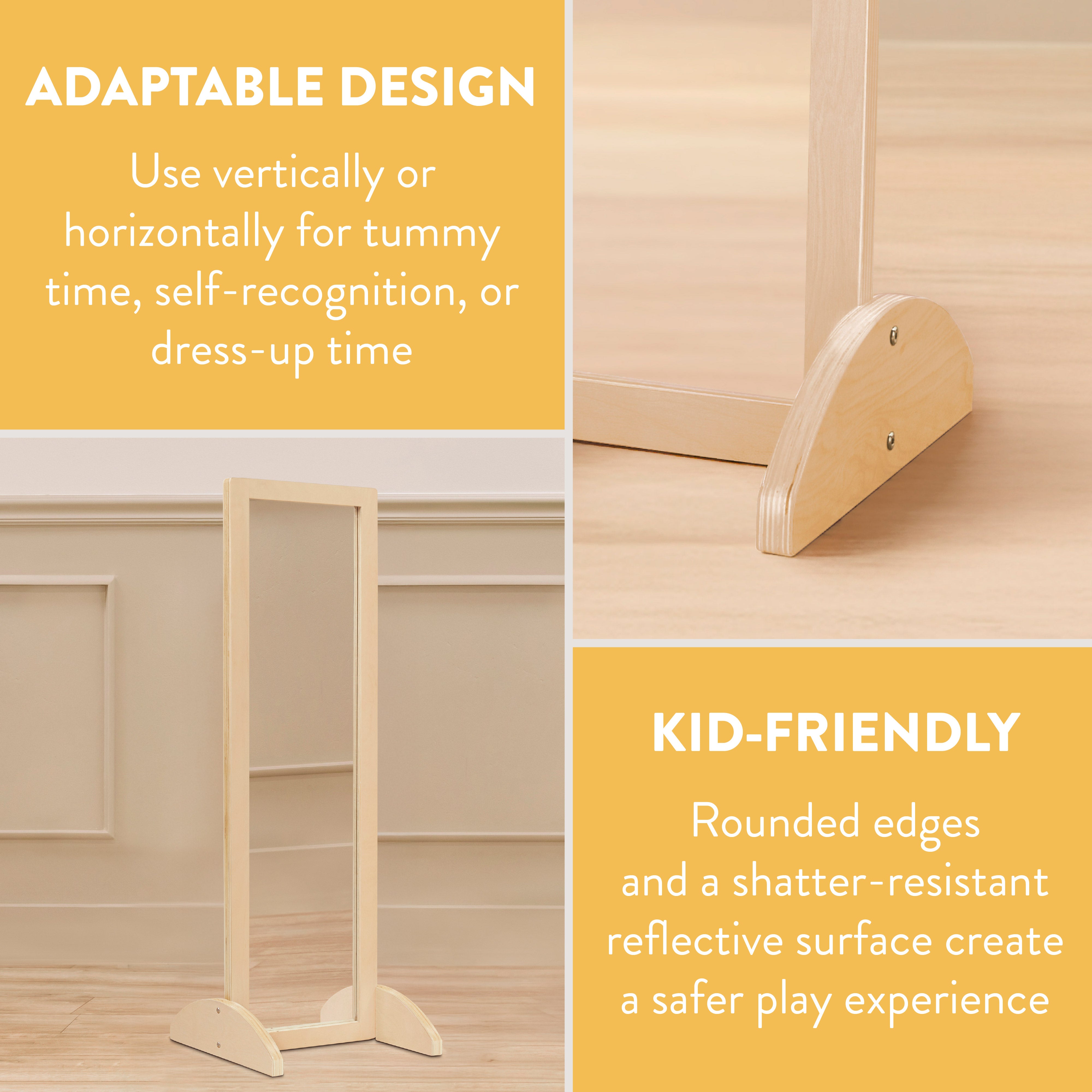 Inspire curiosity and self-expression with the Back2School Express Single-Sided Bi-Directional Mirror, designed to help little ones see themselves and the world around them. The bi-directional mirror features an adaptable design that can be used horizontally or vertically, making it perfect as a tummy time mirror for infants or a stand-up mirror beside a toddler dresser or kids vanity. This full-length standing mirror is perfectly sized to encourage dress-up, pretend play, and morning routines. It is ideal for kids' bedroom furniture or a Montessori-inspired play space. Babies engage during floor play with the safety mirror, while toddlers enjoy expressing themselves in dramatic play in the upright position. Crafted from sustainably sourced birch plywood, this tummy time mirror features a durable, scratch-resistant finish that protects the wood surface from daily wear. A UV inhibitor helps prevent discoloration for long-lasting quality. Strong and sturdy, the natural birch plywood construction is designed to withstand everyday use in a busy home, classroom, and daycare environment. Ideal for nursery, playroom, and daycare furniture setups, this stylish full-length mirror is also a practical and engaging tool for early learning.