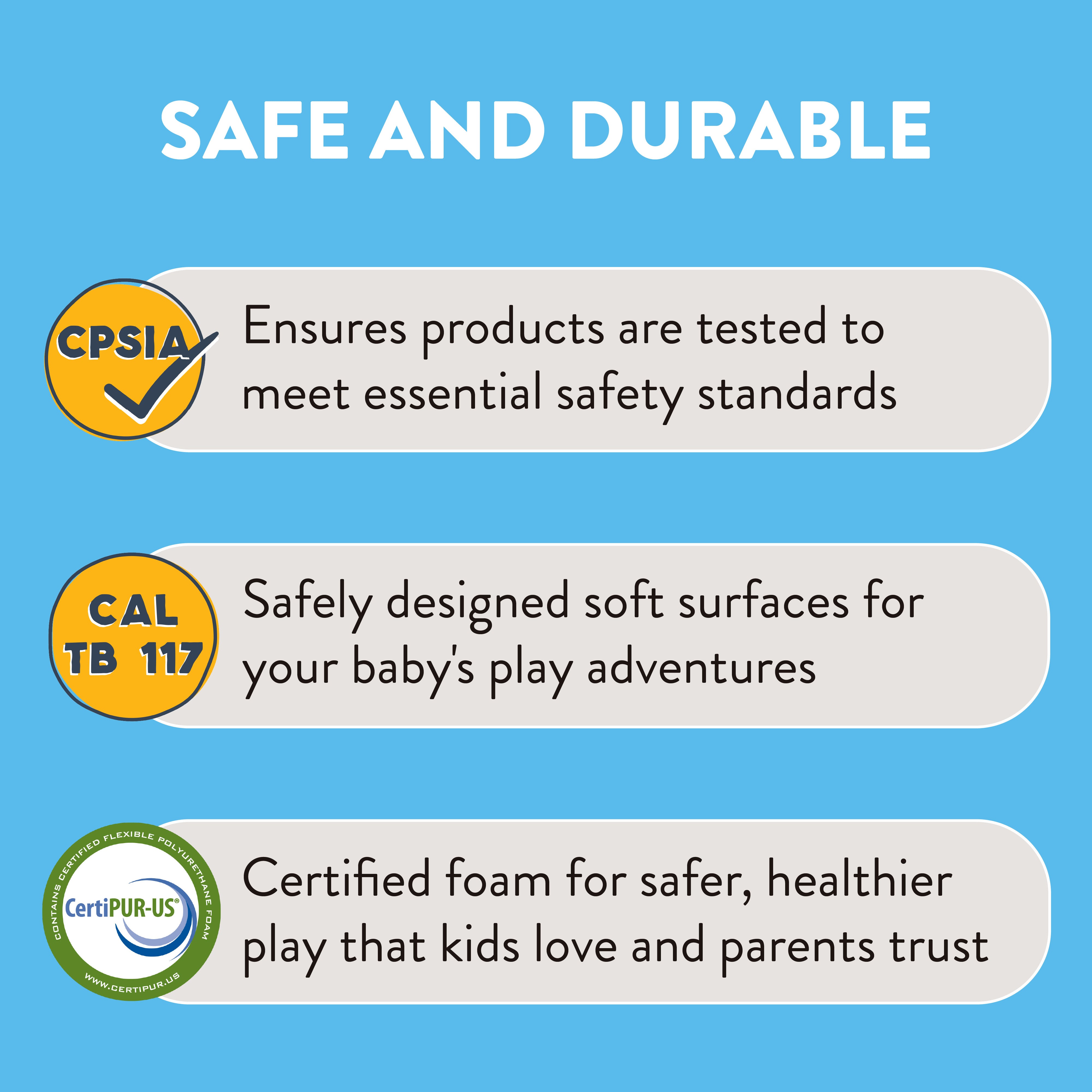 • Safe & Durable: Foam mats are constructed with CertiPUR-US Certified foam, meets CAL TB 117 standards, is CPSIA compliant, and UL GREENGUARD Gold Certified to help create a healthier indoor environment