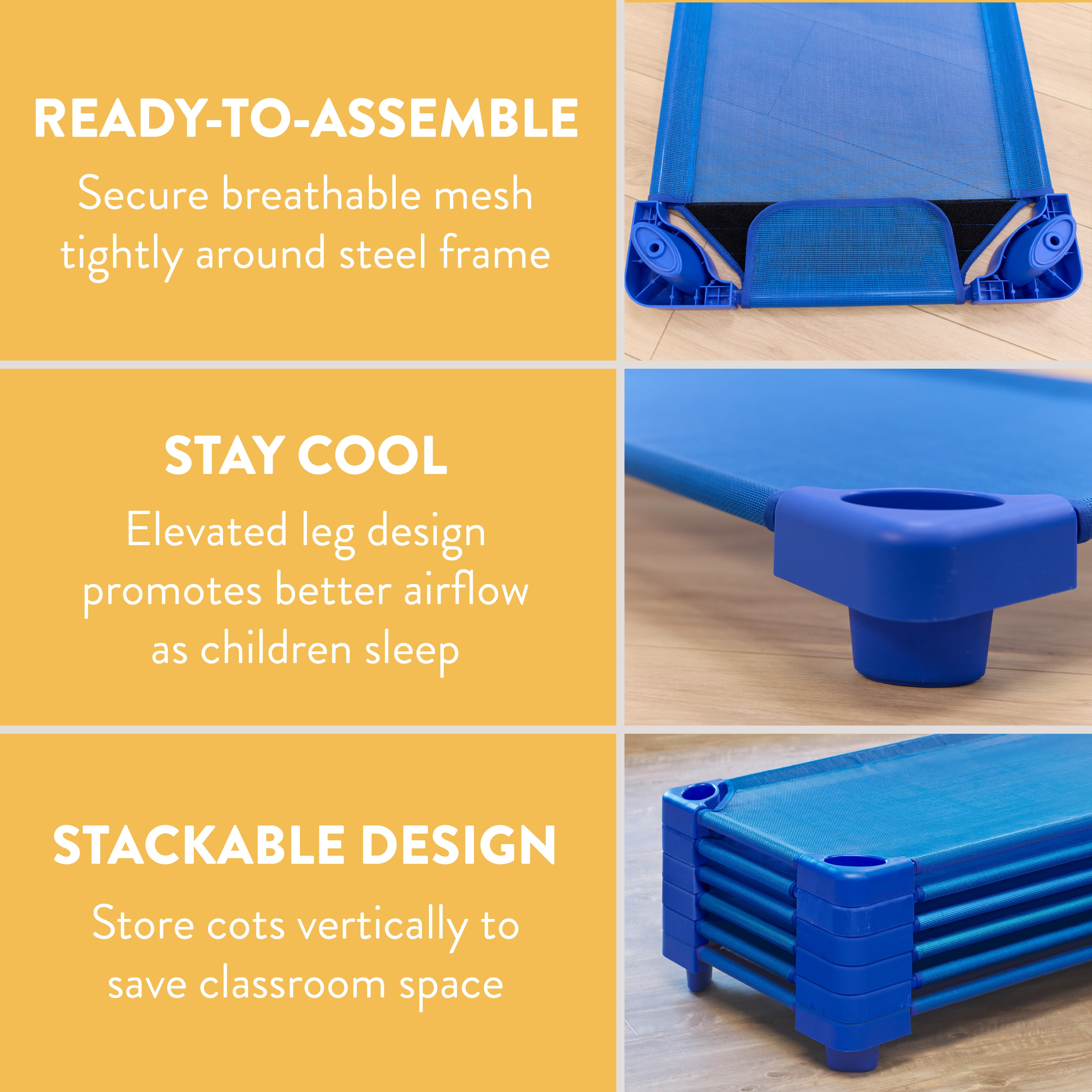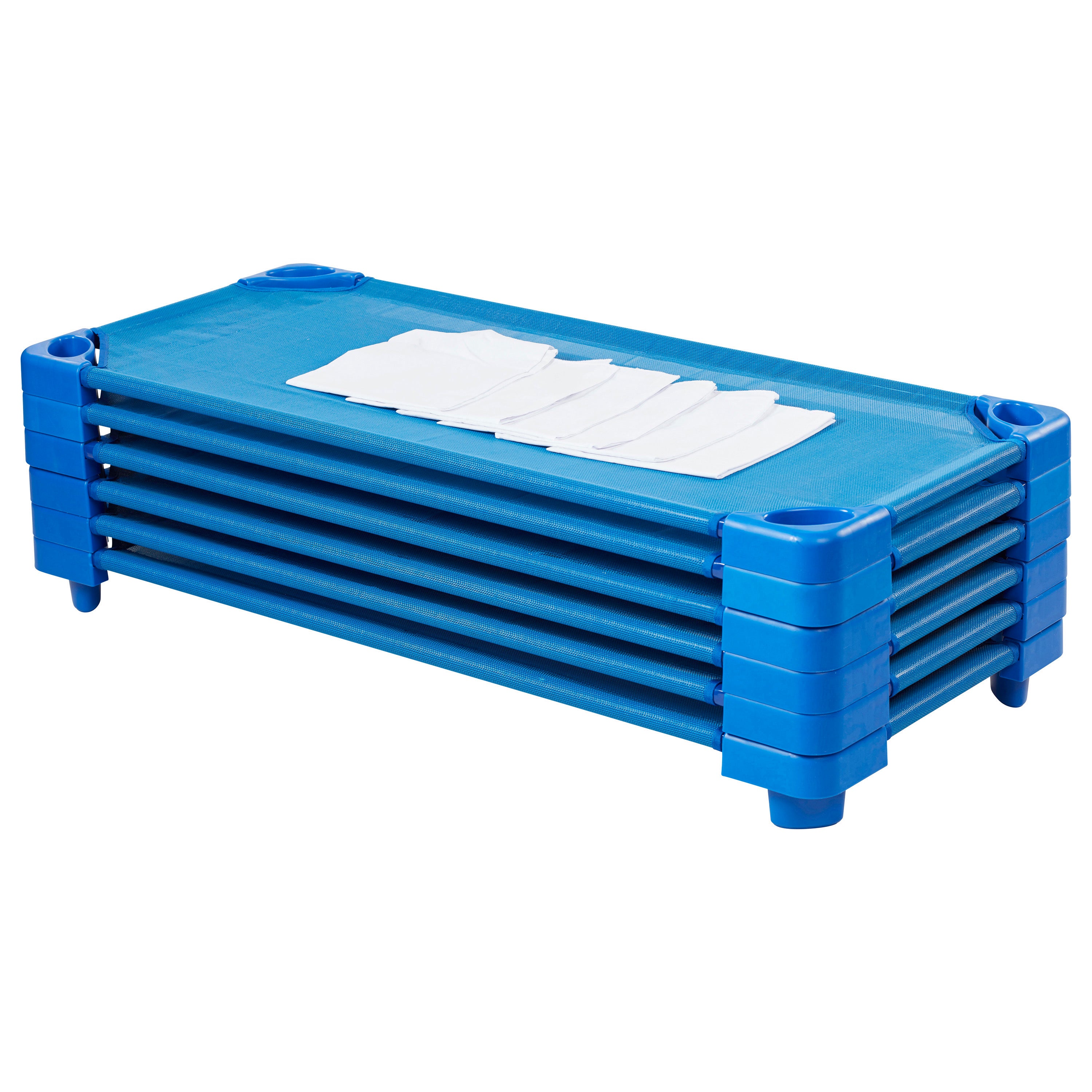 Encourage restful routines with the Back2School Express Sleepline Stackable Cots with Sheets, a ready-to-assemble 6-pack. Whether setting up nap cots for preschool or creating a dedicated sleep space in a home daycare, this thoughtfully designed 6-pack offers a practical and reliable solution for everyday naptime needs. Regular naps support healthy growth, memory development, and emotional well-being, helping little ones recharge and return to learning with focus and energy. Each daycare cot features a breathable mesh sleep surface and reinforced corners secured to a sturdy, powder-coated steel frame. Tightly secured mesh at every corner provides a supportive, gap-free surface for children's safety and comfort. Children will enjoy a cozy rest with fitted sheets secured to all four corners. Lightweight, these cots for daycare stack vertically to maximize floor space in classrooms, playrooms, or homes. The elevated design keeps kids comfortably off the floor, while the low-profile height encourages independence as children settle in for rest. Durable, easy to clean, and crafted to handle busy days, the cot set helps create a consistent and calming environment where children can recharge. The ready-to-assemble design allows for quick setup, making it easy to create a dedicated sleep space without added stress.
