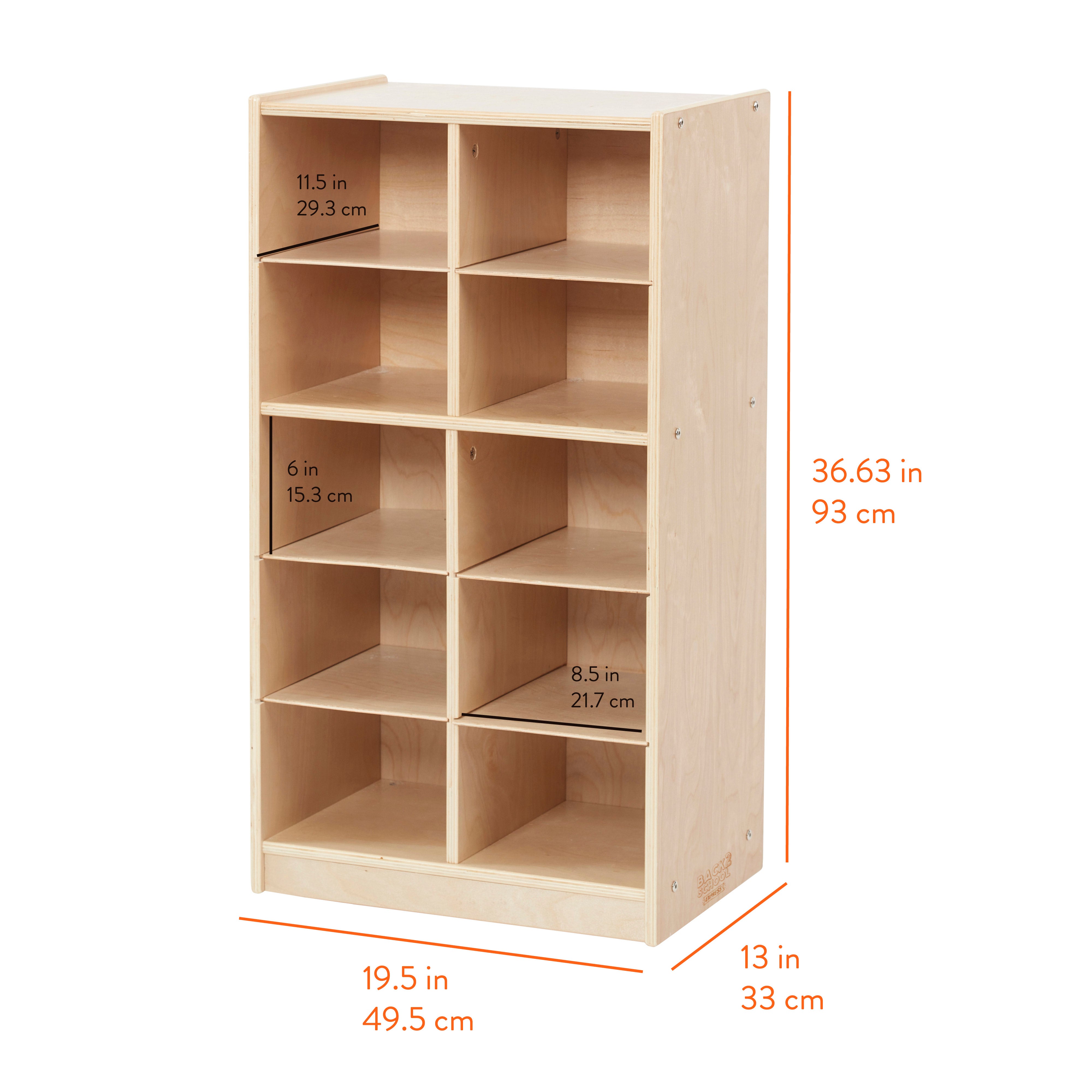 Keep kids’ spaces tidy and accessible with the Back2School Express 10-Compartment Mobile Cubby Storage Cabinet—a versatile organizer designed for busy homes, playrooms, and learning areas. With 10 individual cubbies in a 5x2 grid, this storage unit offers ample space for toy storage, organizing books, classroom supplies, and personal belongings, encouraging everyday independence and responsibility in children. Use the kids shelf as a playroom organizer, sorting small items, a homework station during study time, or as a creative display area with labeled storage bins or small baskets. The open cubby design makes it easy for kids to find and store their items, supporting a well-organized and clutter-free environment. Crafted from sustainably sourced birch plywood, this furniture features a durable, scratch-resistant finish that protects the wood surface from daily wear. A UV inhibitor helps prevent discoloration for long-lasting quality. Strong and sturdy, the natural birch plywood construction is designed to withstand everyday use in a school or daycare environment. This mobile toy storage organizer features four casters and is designed for easy movement, allowing you to refresh play areas or rearrange a room with ease. Its smooth-rolling design offers flexibility for evolving home setups and growing needs.
