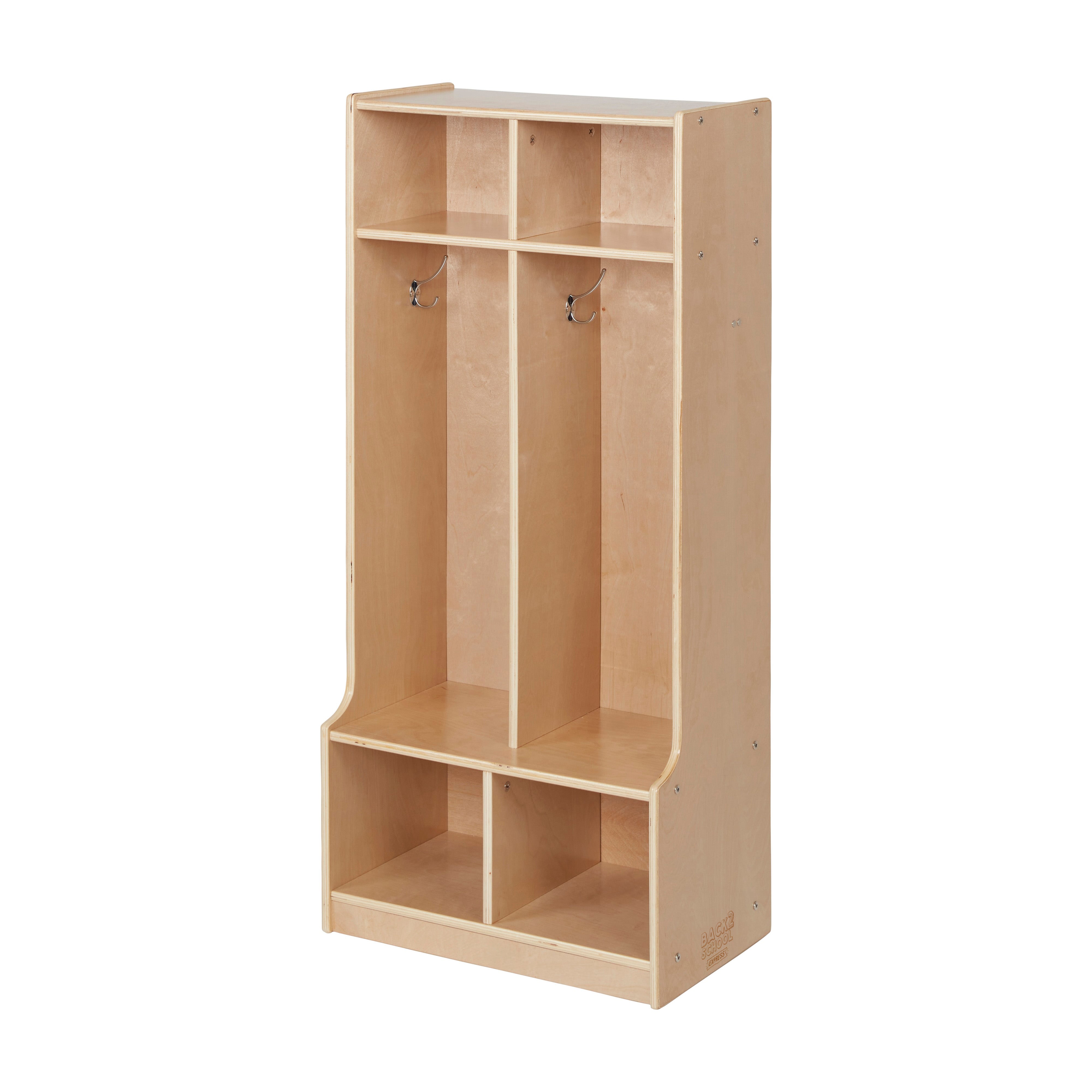 Give kids a dedicated space to store backpacks, coats, shoes, and classroom essentials with the Back2School Express 2-Section Coat Locker with Bench. Designed for use in a home, daycare, or classroom, this versatile shelving unit keeps everything organized and easily accessible while helping children develop independent organization skills. Little ones can sit comfortably on the built-in bench while putting on or taking off their shoes, making daily routines smoother and fostering independence. Featuring two spacious compartments, each section includes double coat hooks for jackets, sweaters, and backpacks, while the additional cubbies provide extra room for shoes, lunchboxes, or personal items. The compact space-saving design makes the backpack cubby storage for home ideal for entryways, playrooms, mudrooms, or small learning spaces, keeping items neatly stored. Beyond school essentials, this multipurpose storage solution is perfect for dress-up clothes, toys, books, and classroom supplies, keeping spaces clutter-free. Crafted from sustainably sourced birch plywood, the kids cubbies feature a durable, scratch-resistant finish that protects the wood surface from daily wear. A UV inhibitor helps prevent discoloration for long-lasting quality. Strong and sturdy, the natural birch plywood construction is designed to withstand everyday use in a busy school or daycare environment.