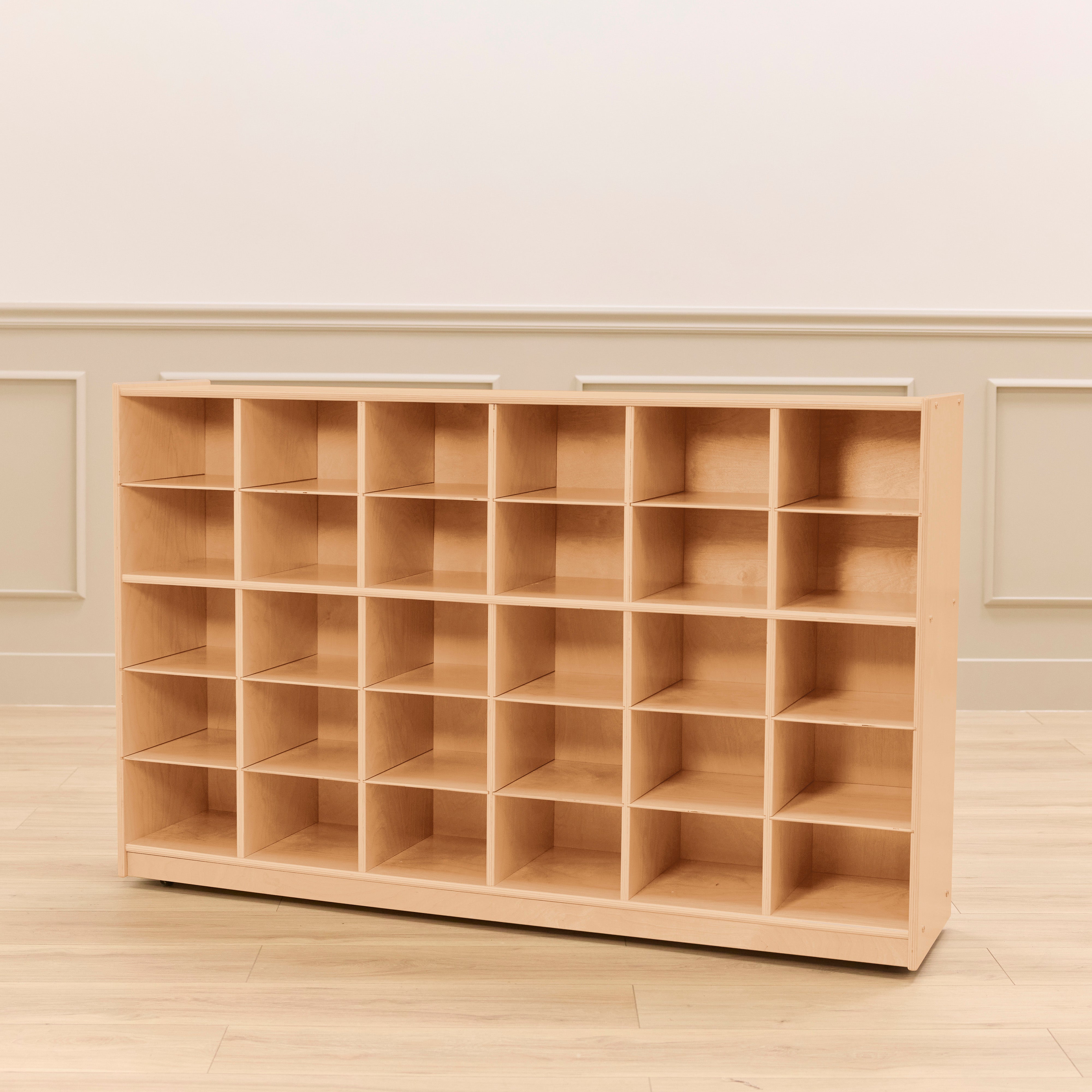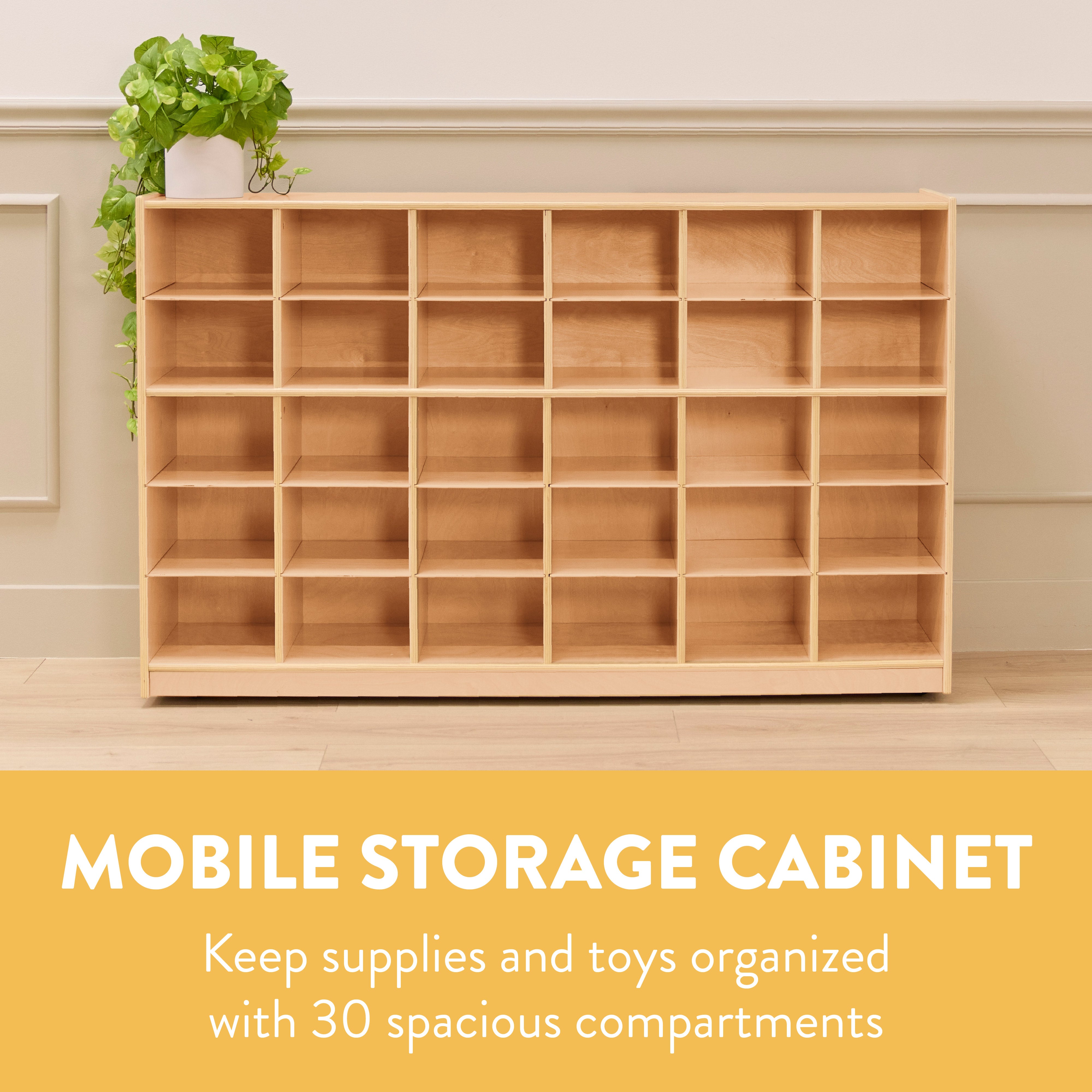 Keep kids’ spaces tidy and accessible with the Back2School Express 30-Compartment Mobile Cubby Storage Cabinet—a versatile organizer designed for busy homes, playrooms, and learning areas. With 30 individual cubbies in a 5x6 grid, this storage unit offers ample space for toy storage, organizing books, classroom supplies, and personal belongings, encouraging everyday independence and responsibility in children. Use the kids shelf as a playroom organizer, sorting small items, a homework station during study time, or as a creative display area with labeled storage bins or small baskets. The open cubby design makes it easy for kids to find and store their items, supporting a well-organized and clutter-free environment. Crafted from sustainably sourced birch plywood, this furniture features a durable, scratch-resistant finish that protects the wood surface from daily wear. A UV inhibitor helps prevent discoloration for long-lasting quality. Strong and sturdy, the natural birch plywood construction is designed to withstand everyday use in a school or daycare environment. This mobile toy storage organizer features four casters and is designed for easy movement, allowing you to refresh play areas or rearrange a room with ease. Its smooth-rolling design offers flexibility for evolving home setups and growing needs.