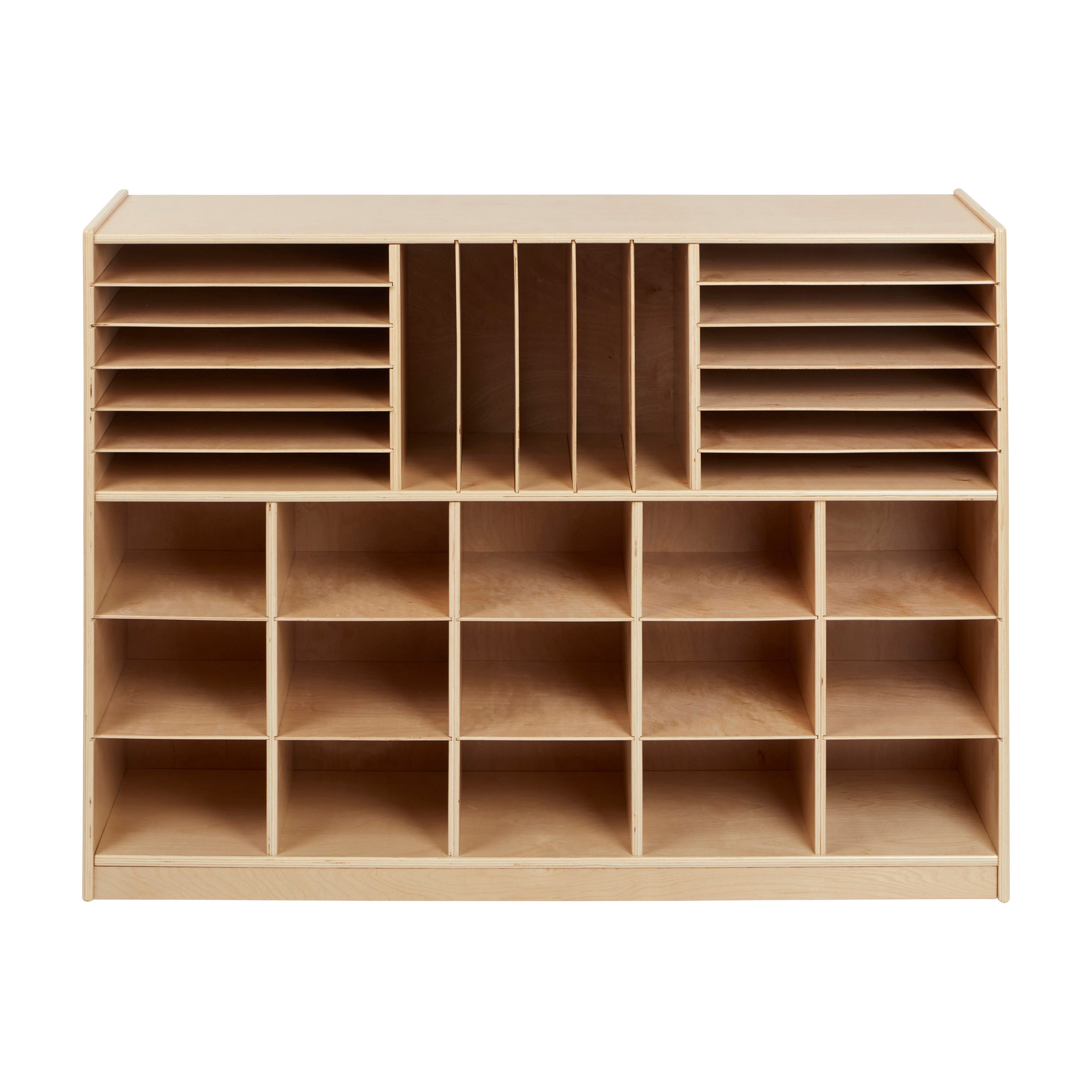 Keep learning spaces neat and accessible with the Back2School Express Multi-Function Cubby and Tray Mobile Storage Cabinet, a smart, space-saving solution for organizing papers, projects, and supplies. This versatile organizer features 15 cubby compartments, 12 tray shelves, and 5 vertical slots, making it ideal for storing art materials, books, classroom essentials and homework folders. Perfect for home learning setups, playrooms, or classrooms, this multi-section cabinet supports daily routines with ease. Use it as a homeschool organizer, classroom cabinet, or teacher storage solution to keep materials sorted and within reach. Use on its own or pair it with storage bins to keep smaller items neatly organized. Designed with a back panel to keep items securely in place, this art shelf is ideal for positioning against a wall, helping maximize floor space. Crafted from sustainably sourced birch plywood, this bookcase features a durable, scratch-resistant finish that protects the wood surface from daily wear. A UV inhibitor helps prevent discoloration for long-lasting quality. Strong and sturdy, the natural birch plywood construction is designed to withstand everyday use in a busy home or preschool. The mobile storage organizer features four smooth-rolling casters, making it easy to move between spaces—perfect for classroom essentials.