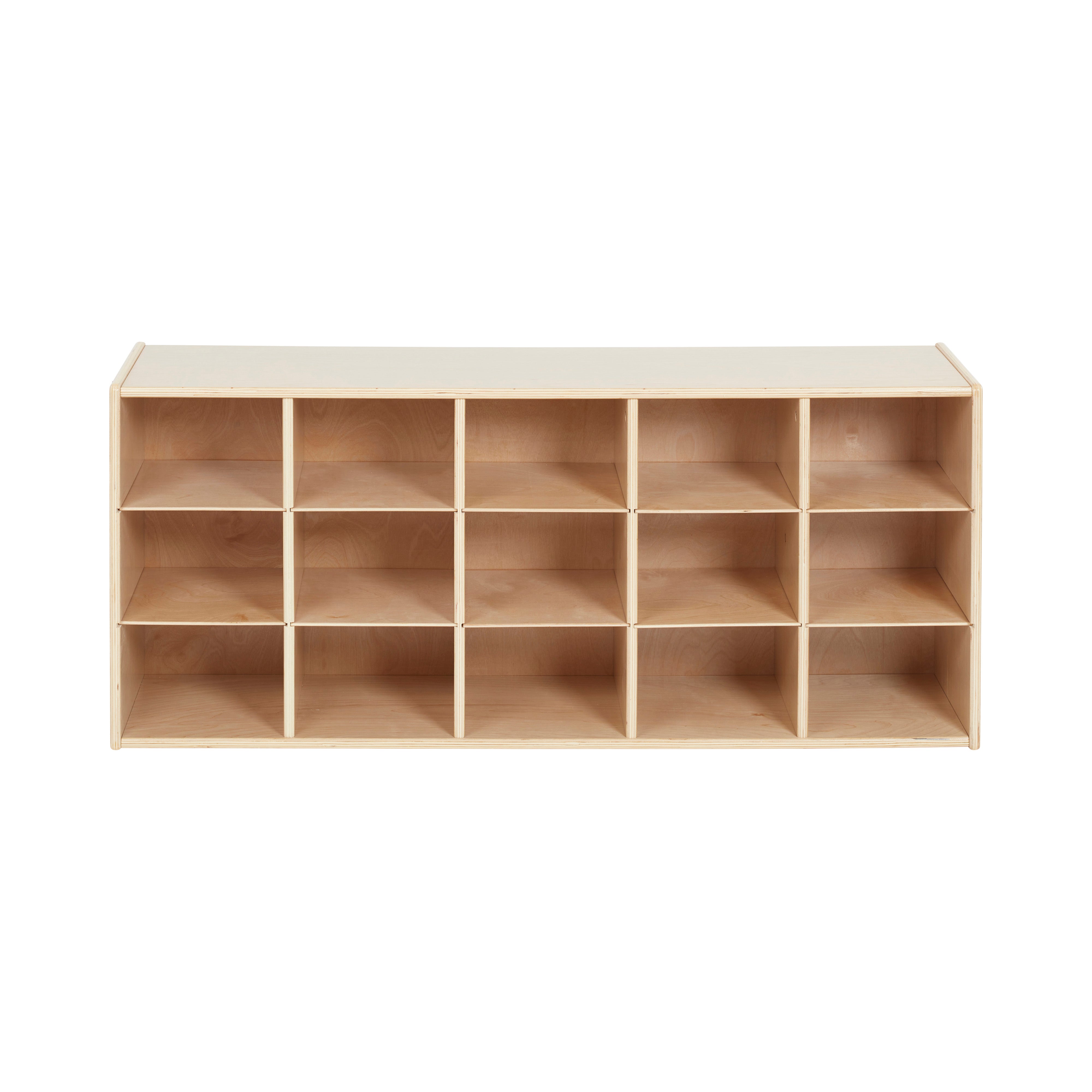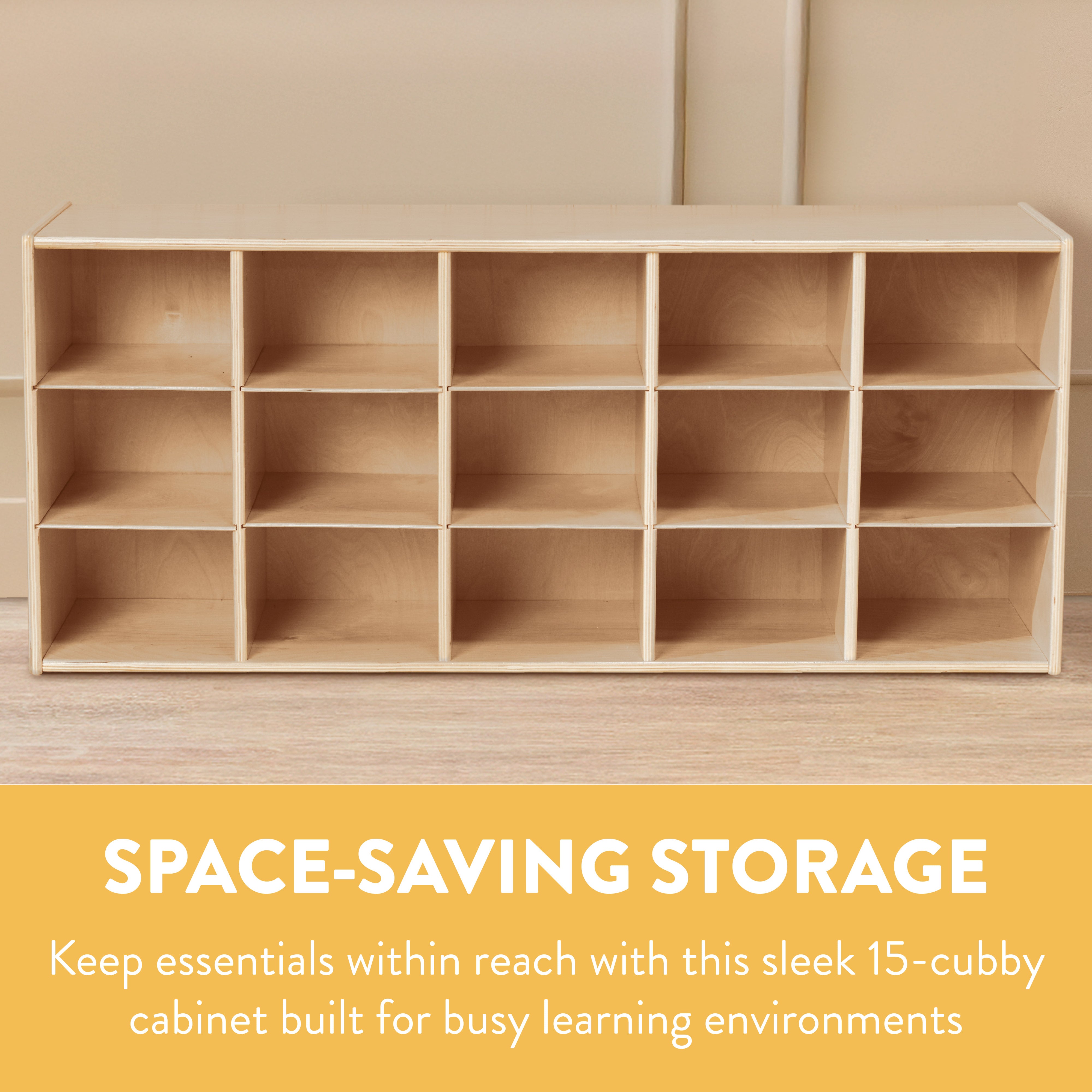 Keep kids’ spaces tidy and accessible with the Back2School Express Sleekline 15-Compartment Cubby Storage Cabinet—a versatile organizer designed for busy homes, playrooms, and learning areas. With 15 storage cubbies in a 3x5 grid, this storage unit offers ample space for toy storage, organizing books, classroom supplies, and personal belongings, encouraging everyday independence and responsibility in children. Use the Montessori shelf as a playroom organizer or as classroom furniture, sorting small items, or as a creative display area with labeled storage bins for daycare essentials. Designed with a back panel to keep items securely in place, this shelf organizer is ideal for positioning against a wall, helping maximize floor space. The open cubby design makes it easy for kids to find and store their items, supporting a well-organized and clutter-free environment. Crafted from sustainably sourced birch plywood, this cubby storage organizer features a durable, scratch-resistant finish that protects the wood surface from daily wear. A UV inhibitor helps prevent discoloration for long-lasting quality. Strong and sturdy, the natural birch plywood construction is designed to withstand everyday use in a school or daycare environment. Whether used as playroom furniture or as classroom shelves, this storage unit offers a space-saving solution.