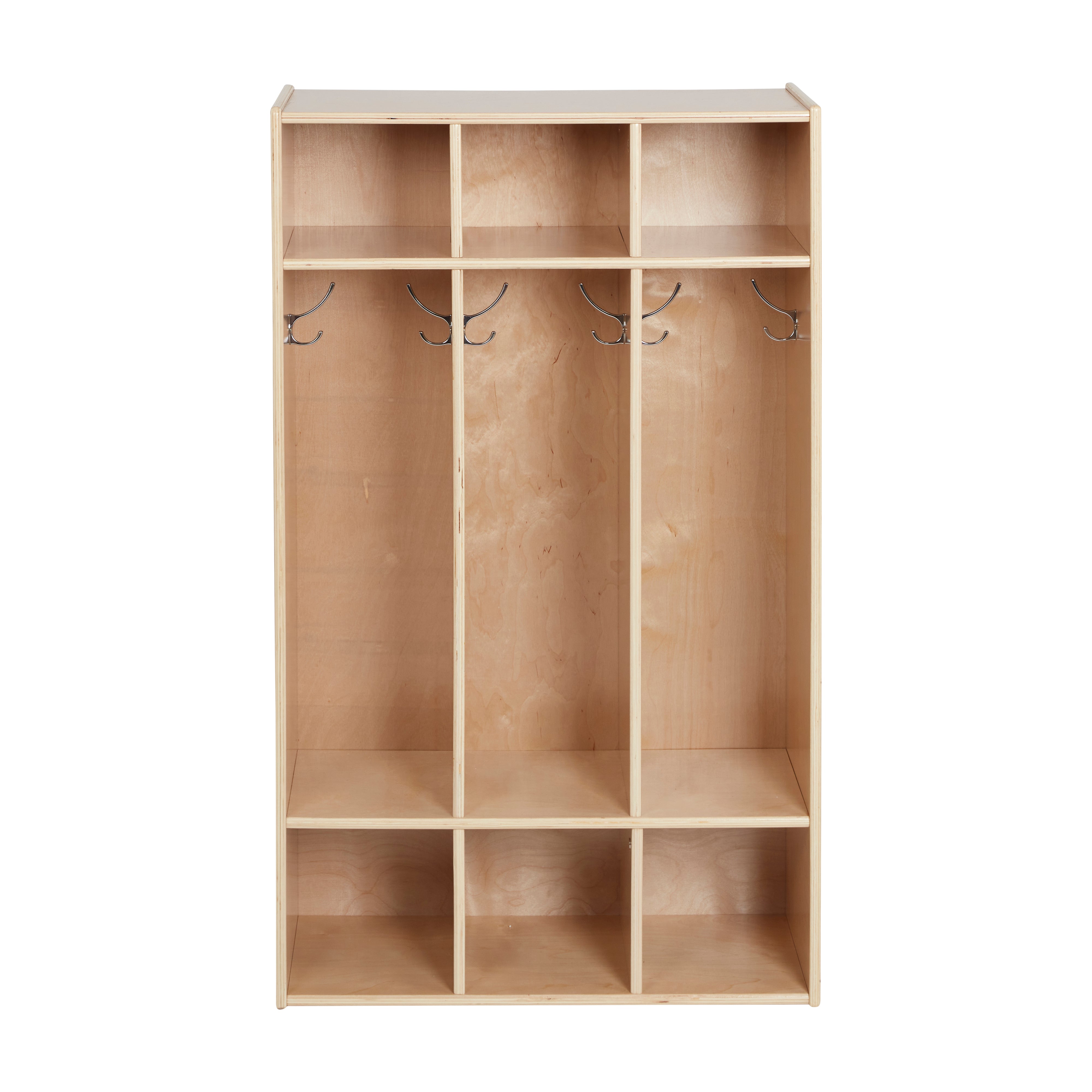 Give kids a dedicated space to store backpacks, coats, shoes, and classroom essentials with the Back2School Express Sleekline 3-Section Coat Locker. Designed for use in a home, daycare, or classroom, this versatile shelving unit keeps everything organized and easily accessible while helping children develop independent organization skills. Featuring three spacious compartments, each section includes double coat hooks for jackets, sweaters, and backpacks, while the additional cubbies provide extra room for shoes, lunchboxes, or personal items. The compact space-saving design makes the backpack cubby storage for home ideal for entryways, playrooms, mudrooms, or small learning spaces, keeping items neatly stored. Beyond school essentials, this multipurpose storage solution is perfect for dress-up clothes, toys, books, and classroom supplies, keeping spaces clutter-free. By providing a designated space for belongings, this storage cabinet supports daily routines and encourages responsibility, making the kids cubby a must-have for parents, teachers, and caregivers. Crafted from sustainably sourced birch plywood, the kids cubbies features a durable, scratch-resistant finish that protects the wood surface from daily wear. A UV inhibitor helps prevent discoloration for long-lasting quality. Strong and sturdy, the natural birch plywood construction is designed to withstand everyday use in a busy school or daycare environment.