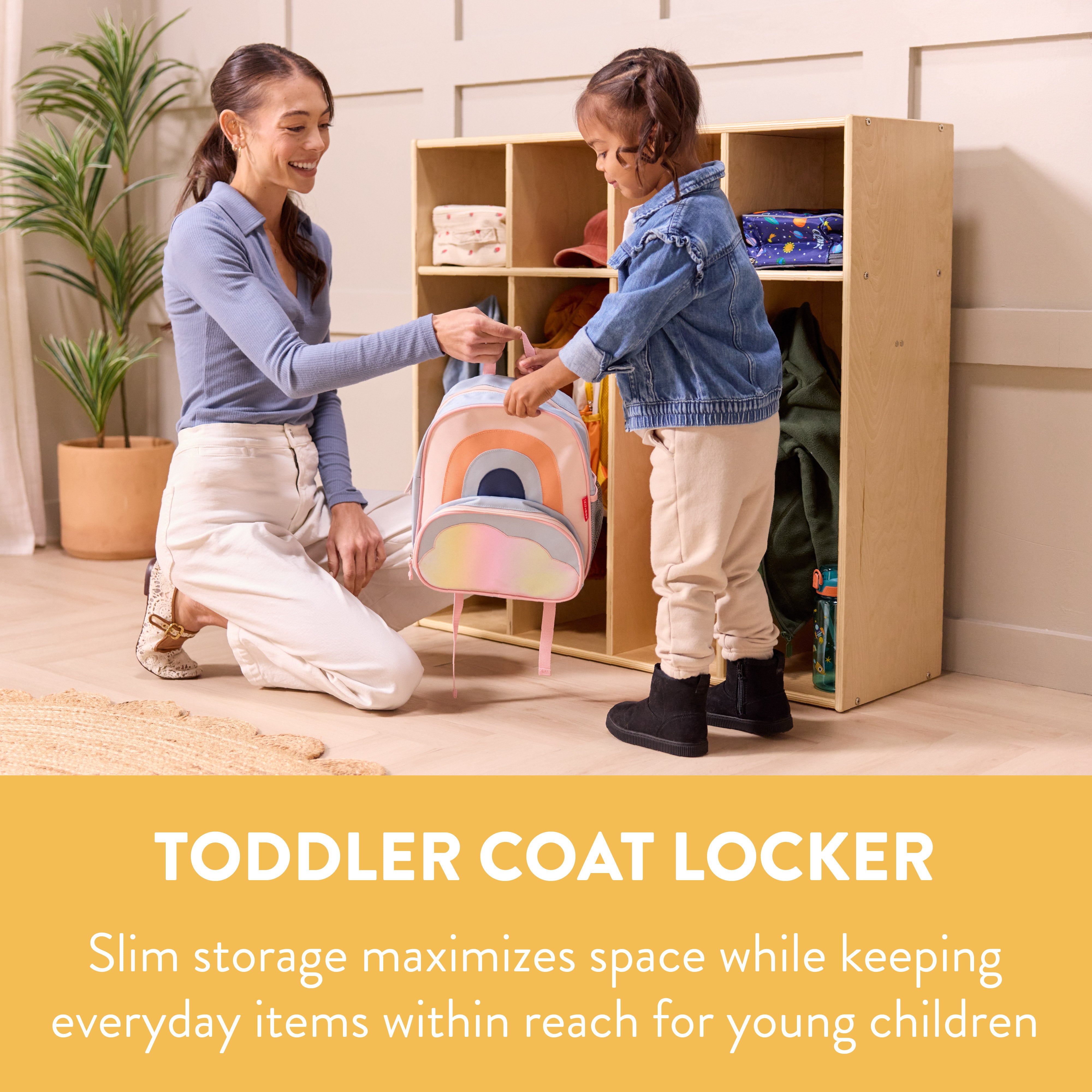 Give kids a dedicated space to store backpacks, coats, shoes, and classroom essentials with the Back2School Express Sleekline 4-Section Toddler-Sized Coat Locker. Designed for use in a home, daycare, or classroom, this versatile shelving unit keeps everything organized and easily accessible while helping children develop independent organization skills. Featuring four spacious compartments, each section includes double coat hooks for jackets, sweaters, and backpacks, while the upper cubbies provide extra room for shoes, lunchboxes, or personal items. The compact space-saving design makes the backpack cubby storage for home ideal for entryways, playrooms, mudrooms, or small learning spaces, keeping items neatly stored. Beyond school essentials, this multipurpose storage solution is perfect for dress-up clothes, toys, books, and classroom supplies, keeping spaces clutter-free. By providing a designated space for belongings, this storage cabinet supports daily routines and encourages responsibility, making the kids cubby a must-have for parents, teachers, and caregivers. Crafted from sustainably sourced birch plywood, the kids cubbies feature a durable, scratch-resistant finish that protects the wood surface from daily wear. A UV inhibitor helps prevent discoloration for long-lasting quality. Strong and sturdy, the natural birch plywood construction is designed to withstand everyday use in a busy school or daycare environment.