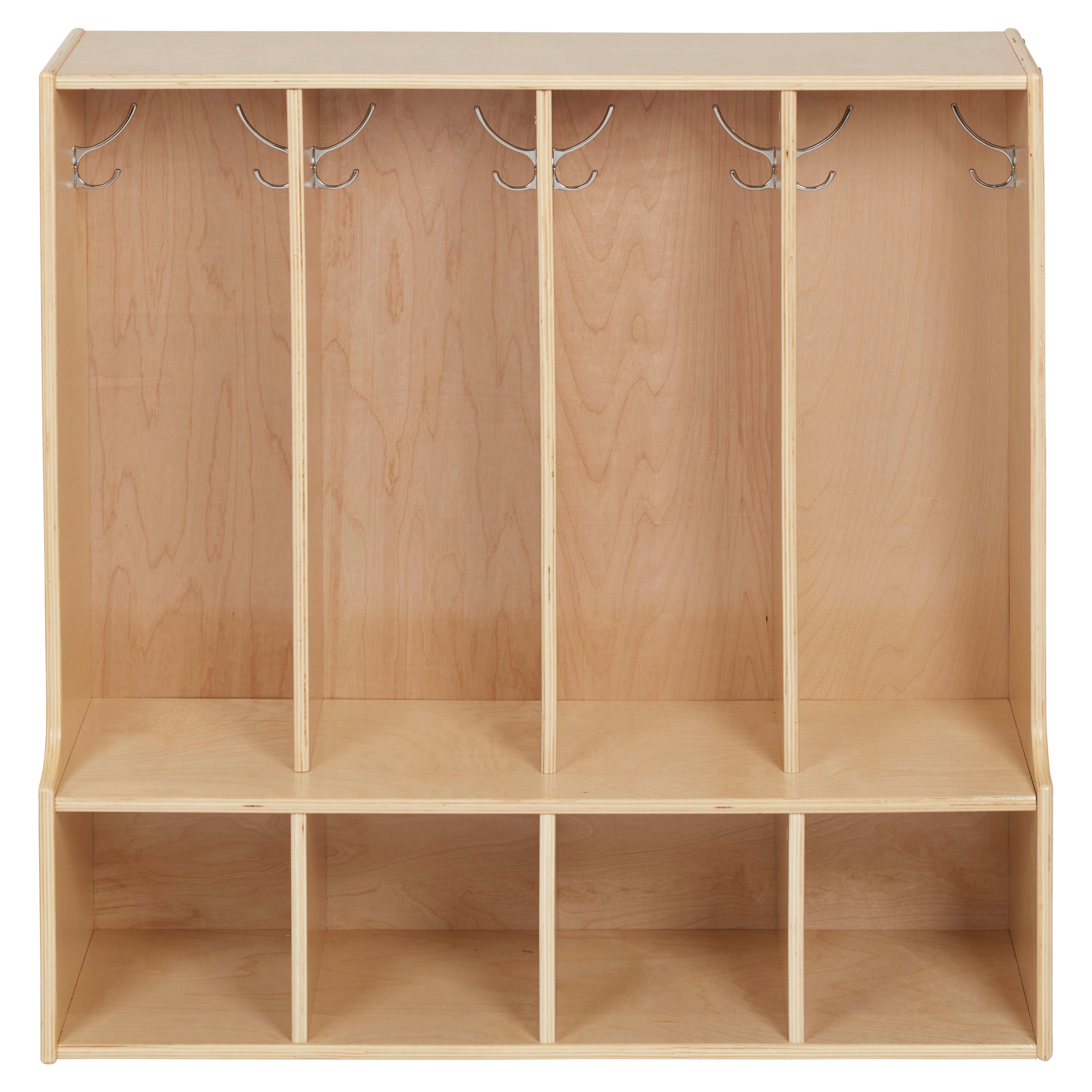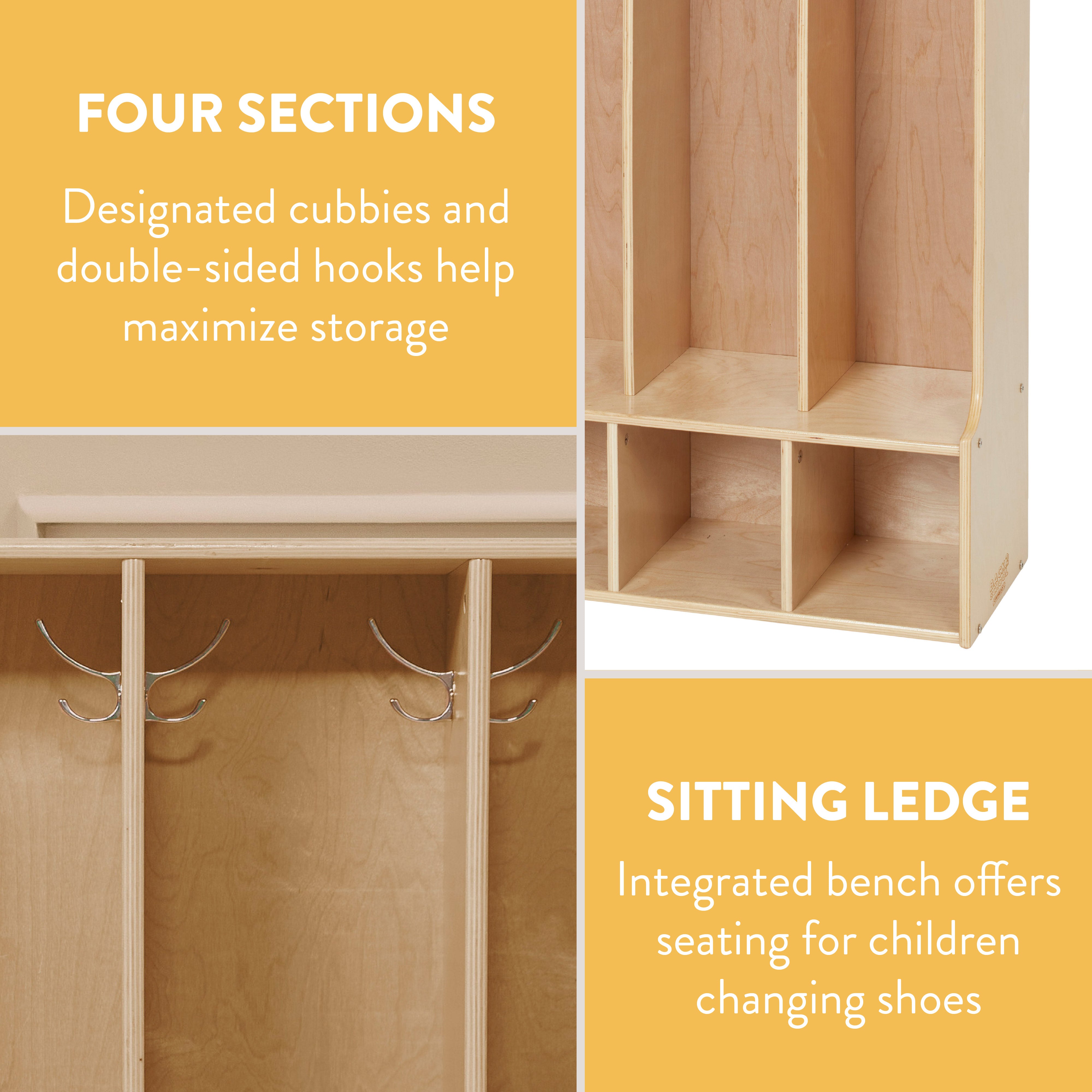 Give kids a dedicated space to store backpacks, coats, shoes, and classroom essentials with the Back2School Express Sleekline 4-Section Toddler-Sized Coat Locker with Bench. Designed for use in a home, daycare, or classroom, this versatile shelving unit keeps everything organized and easily accessible while helping children develop independent organization skills. Little ones can sit comfortably on the built-in bench while putting on or taking off their shoes, making daily routines smoother and fostering independence. Featuring four spacious compartments, each section includes double coat hooks for jackets, sweaters, and backpacks, while the additional cubbies provide extra room for shoes, lunchboxes, or personal items. The compact space-saving design makes the backpack cubby storage for home ideal for entryways, playrooms, mudrooms, or small learning spaces, keeping items neatly stored. Beyond school essentials, this multipurpose storage solution is perfect for dress-up clothes, toys, books, and classroom supplies, keeping spaces clutter-free. Crafted from sustainably sourced birch plywood, the kids cubbies feature a durable, scratch-resistant finish that protects the wood surface from daily wear. A UV inhibitor helps prevent discoloration for long-lasting quality. Strong and sturdy, the natural birch plywood construction is designed to withstand everyday use in a busy school or daycare environment.