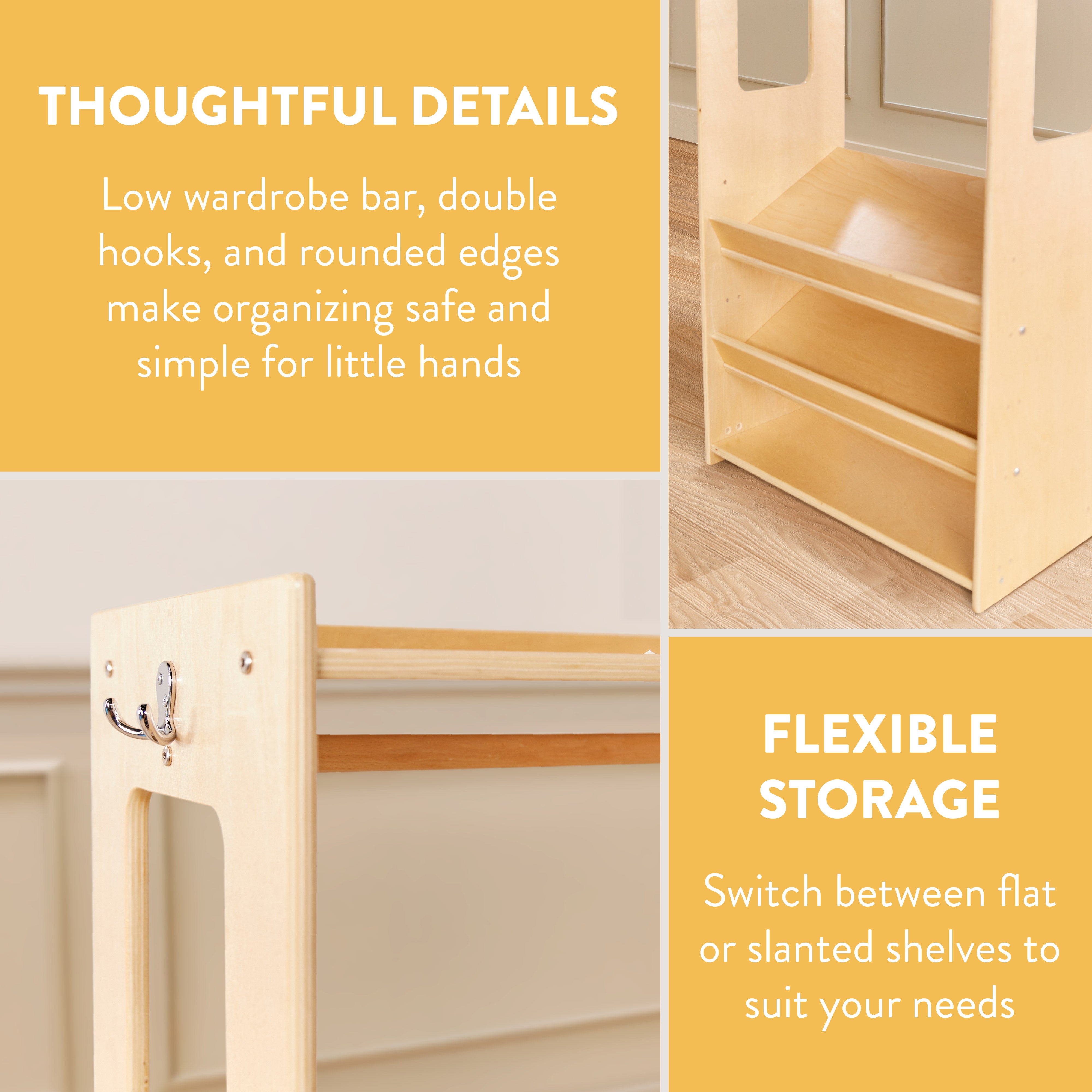 • Dress-Up Storage: Kids armoire with four shelves, two coat hooks, and a sturdy rod for hanging dress-up clothes, keeping outfits organized and within reach for imaginative play and closet storage