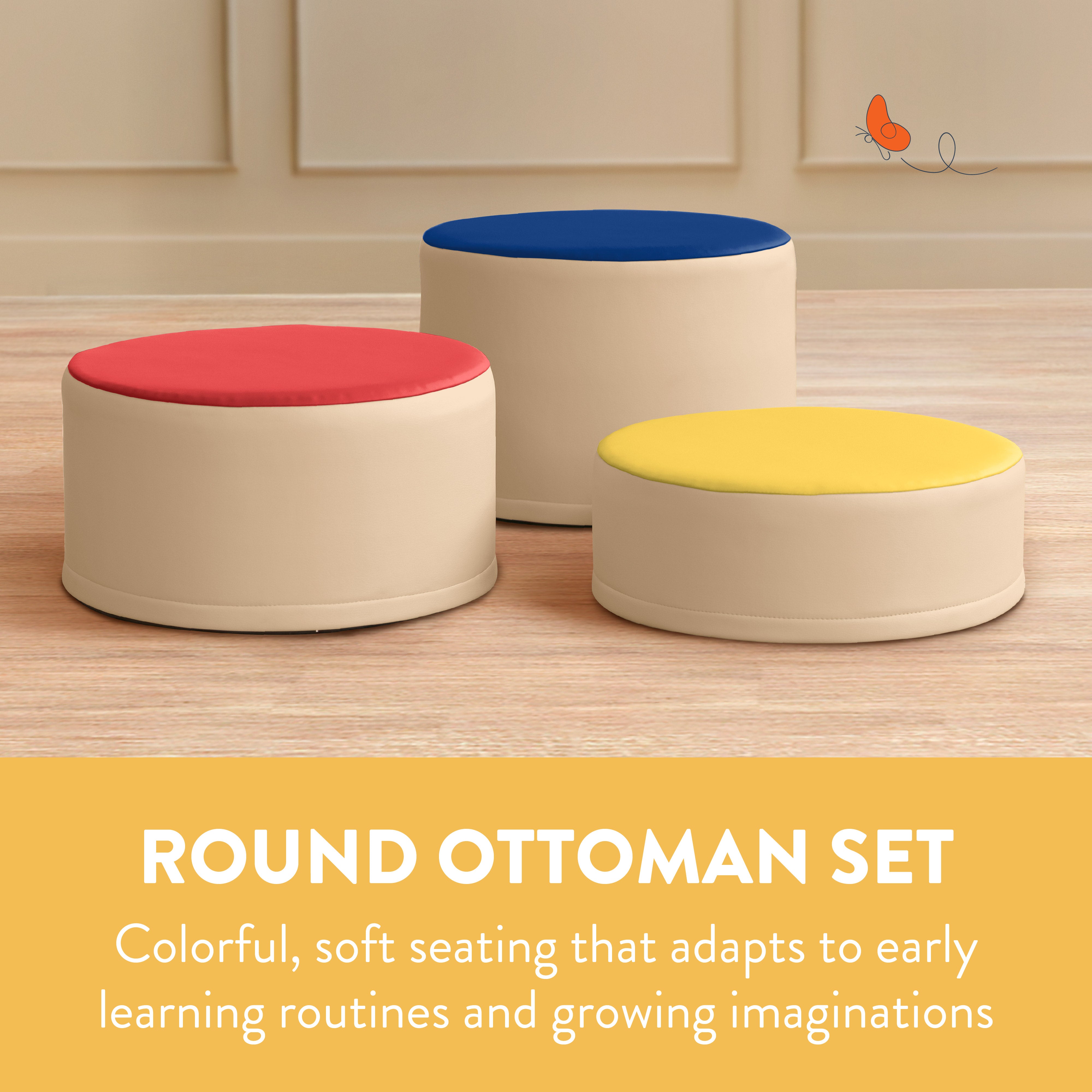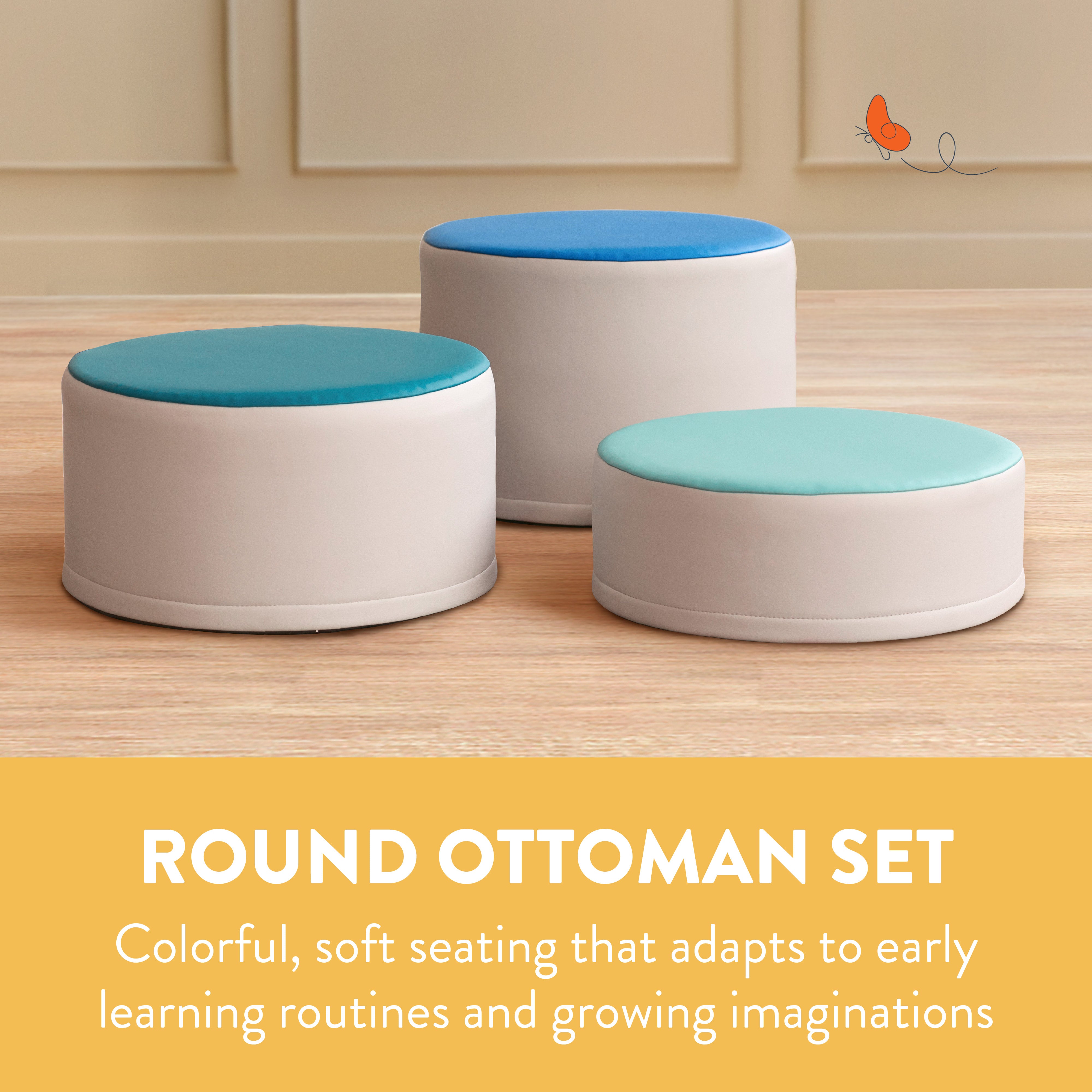 Make room for meaningful moments—whether it’s reading or relaxing—with the Back2School Express Soft Play Round Two-Tone Ottomans. The set is colorful, kid-friendly, and perfect for flexible seating in a home, reading nook, or toddler room essentials. Designed for both play and learning, each round ottoman supports active sitting and collaborative activities during circle time, group work, or quiet reading. Lightweight and easy to move, they serve as the ideal small stool or lower floor chair for kids. Thick foam seats feature a textured non-slip base to help keep them in place during use. Made with kid-safe, high-quality materials that are easy to clean, the classroom stools meet safety standards for use in early learning environments. Each toddler chair is durable, low-maintenance, and designed to withstand everyday play. The floor cushion can also be used as a floor desk in a daycare or playroom, ideal for teachers and parents seeking adaptable classroom must-haves. Whether used as a reading chair, floor seat, or stylish accent for classroom decor, this 3-piece set offers practical comfort and versatile style. Built to last, each piece is durable and easy to clean, making it a smart addition to your classroom furniture.