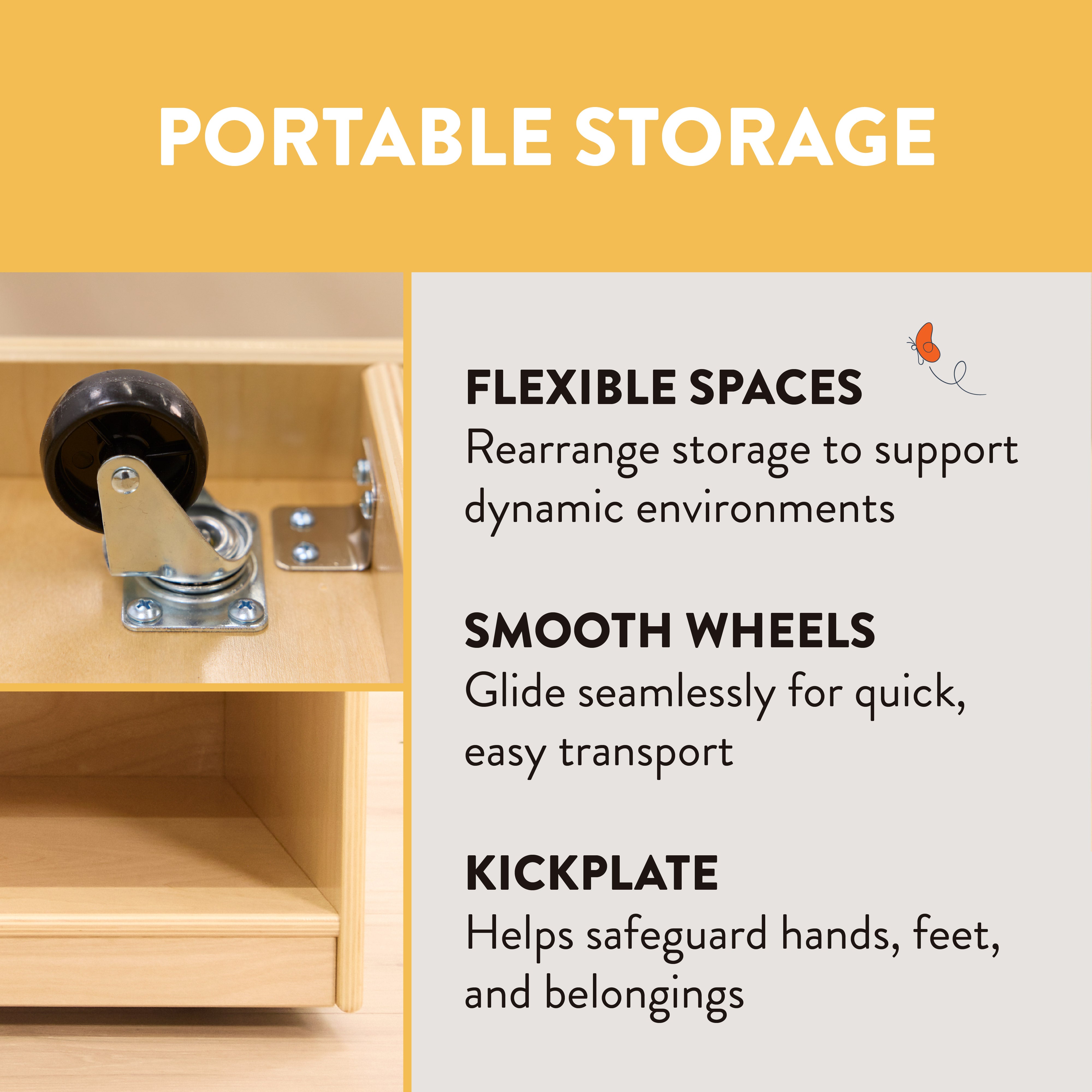 Create a tidy, kid-friendly space at home with the Back2School Express 5-Compartment Mobile Storage Cabinet, a practical solution for organizing books, toys, and learning materials. The starter size of this bookshelf features five spacious storage shelves in a compact design, ideal for puzzles, games, and storage cubes, promoting independence and tidy habits in young learners. Open shelving allows children to easily see and access their belongings, making it a practical addition to a playroom, children’s bedroom, or school. Use the small bookshelf on its own or pair it with storage bins to keep smaller items neatly organized. Designed with a back panel to keep items securely in place, this shelf organizer is ideal for positioning against a wall, helping maximize floor space. Crafted from sustainably sourced birch plywood, this bookcase features a durable, scratch-resistant finish that protects the wood surface from daily wear. A UV inhibitor helps prevent discoloration for long-lasting quality. Strong and sturdy, the natural birch plywood construction is designed to withstand everyday use in a busy home or preschool. The mobile toy storage organizer features four smooth-rolling casters, making it easy to move between spaces—perfect for home décor, living room furniture, or classroom essentials.