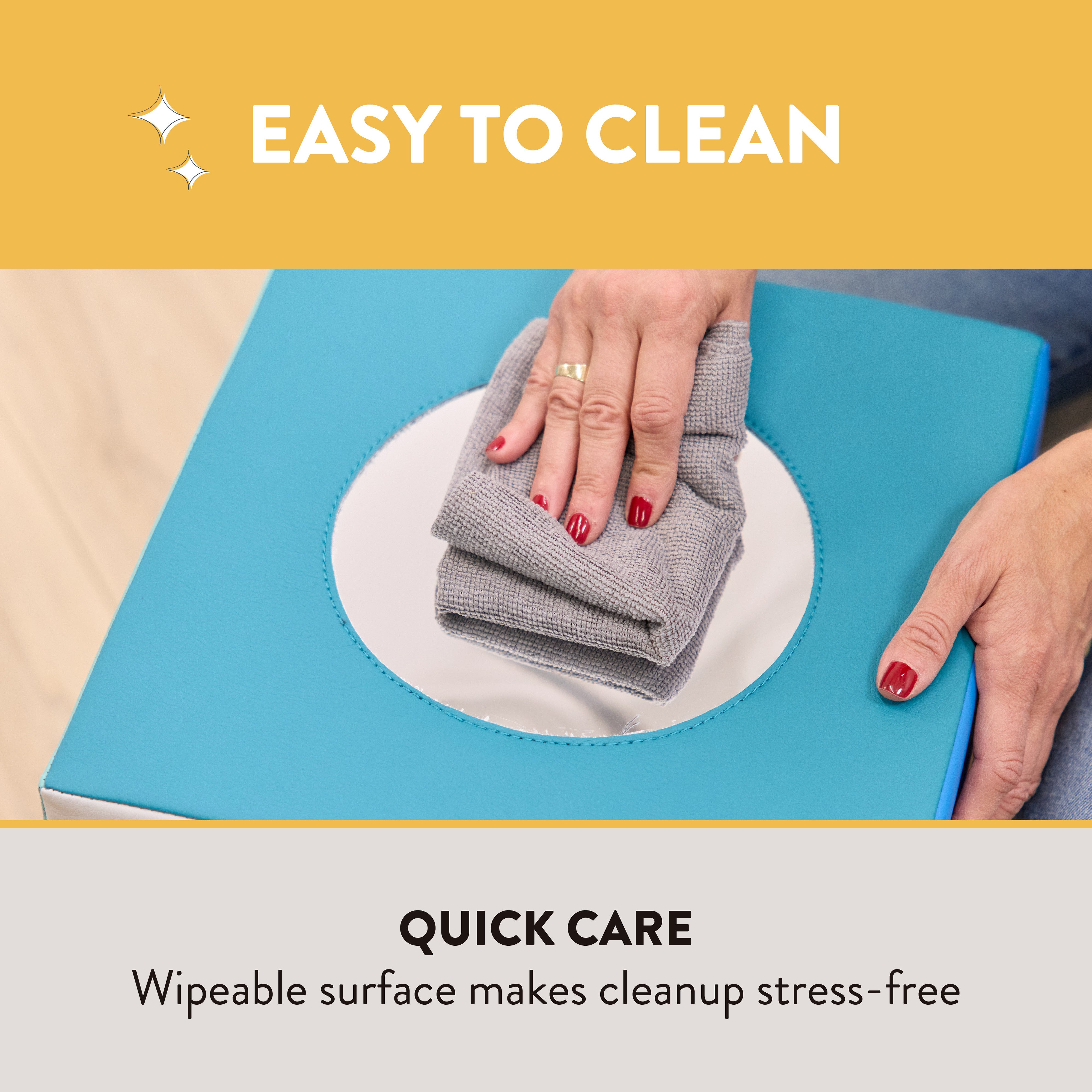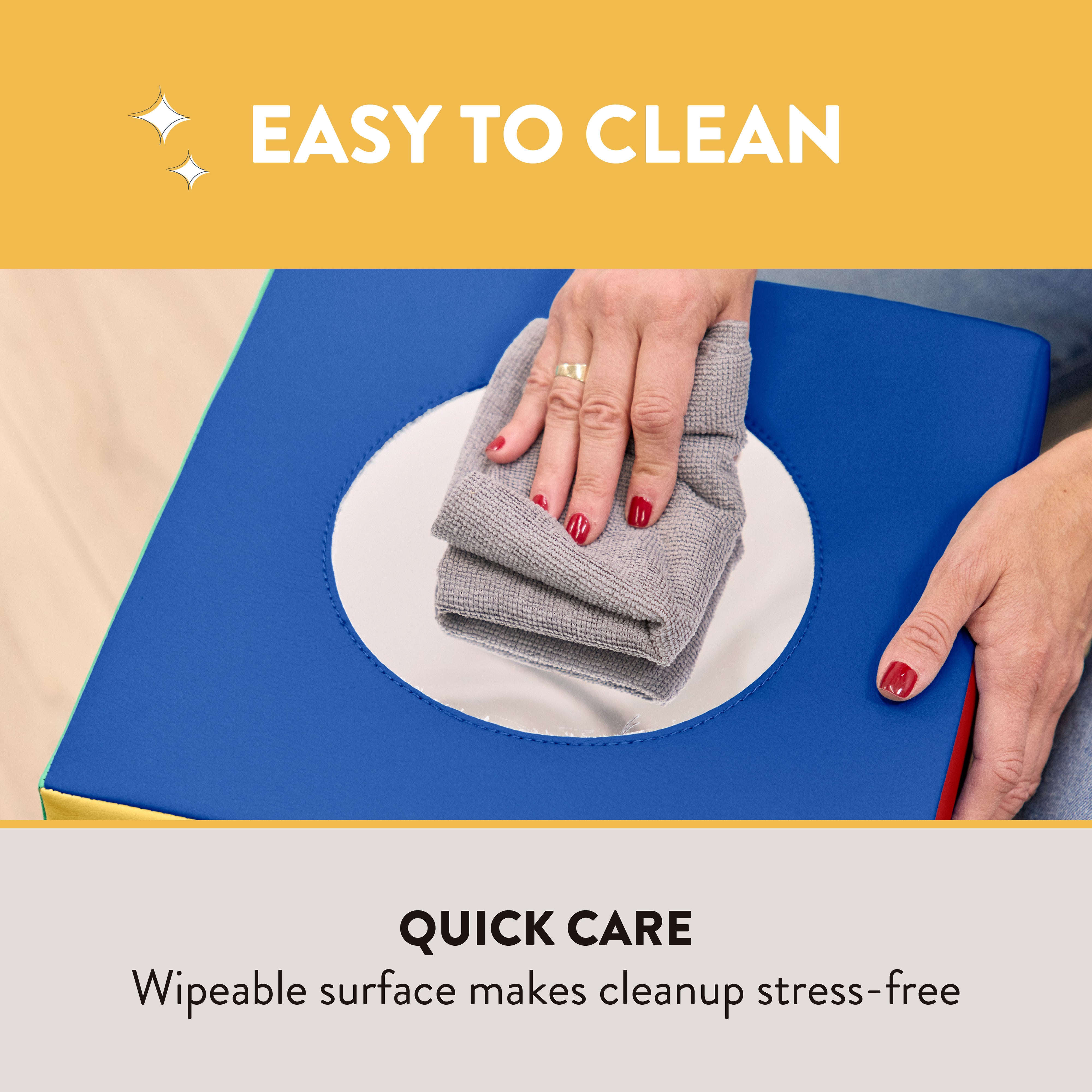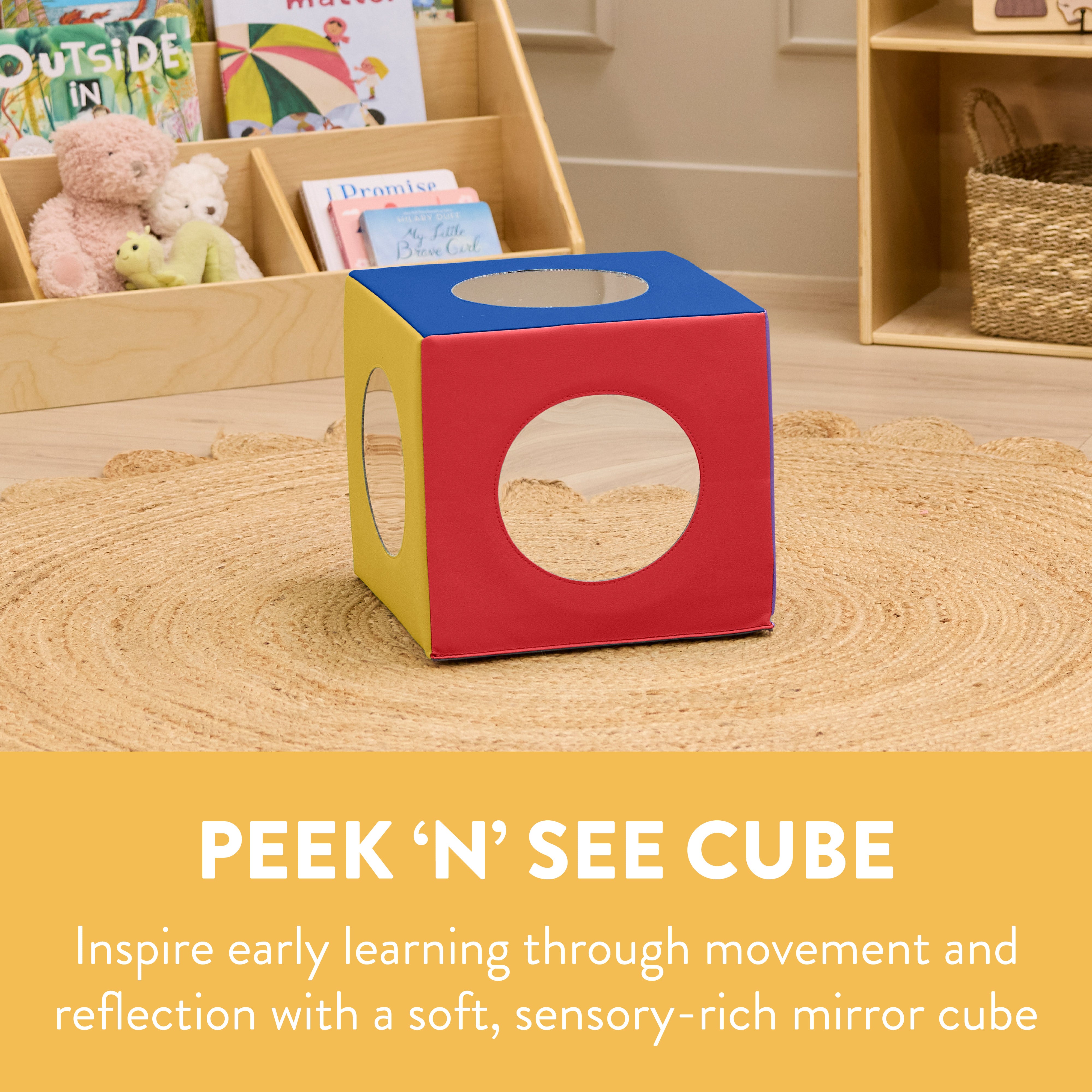 Encourage curiosity, coordination, and recognition with the Back2School Express Peek 'n' See Play Cube—a colorful sensory toy designed to support early learning and motor development. This vibrant activity cube features baby-safe, shatter-resistant mirrors on five sides, inviting little ones to explore reflections, facial expressions, and movement while building self-awareness and visual tracking skills. Babies can enjoy this baby toy during tummy time, using the infant play mirror to observe themselves while building neck and core strength. As they grow, little ones may begin to push up, crawl toward, or practice pulling to stand. Toddlers can engage in imaginative play, using the cube as part of a larger soft play set or integrating it with foam climbing blocks during active play. Perfect for tummy time toys, crawling practice, or calm corner play, this mirror block adds a dynamic element to any space. The thick sensory foam cube features a textured non-slip base to help keep it in place during floor use. Made with kid-safe, high-quality materials that are easy to clean, the baby toy meets safety standards for use in a preschool and early learning environment. The crawling toy is durable, low-maintenance, and designed to withstand everyday play.