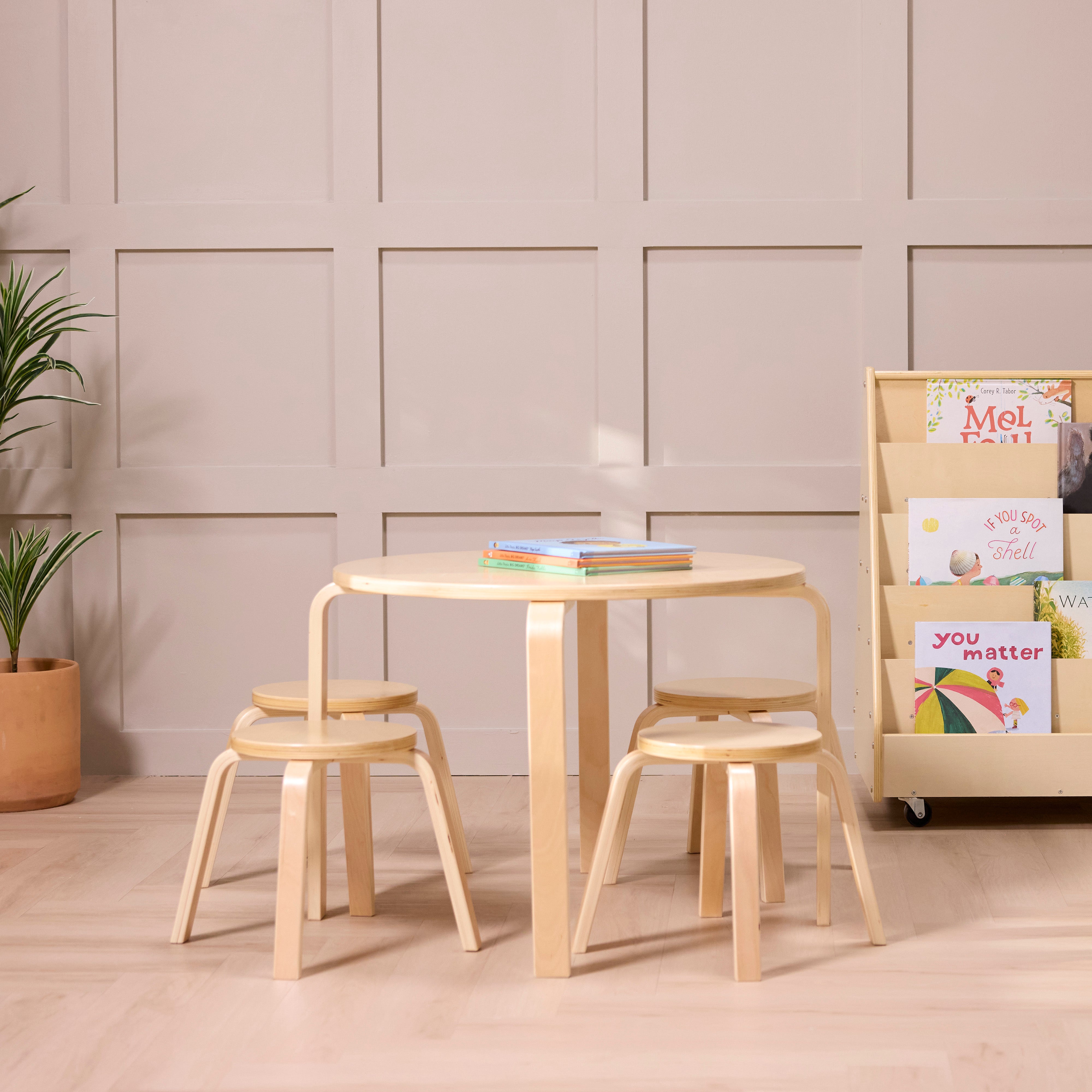 Create the perfect spot for little learners with the Back2School Express Bentwood Kids Table and Stools Set. Thoughtfully designed for a home learning space, playroom, or children's bedroom, this activity play table supports creativity, independence, and everyday routines. Whether it’s time for a snack, crafts, or puzzles, the child-friendly height makes this table and stools set just right for young children. The modern, space-saving design includes one kids table and four toddler stools that slide underneath the kids activity table—ideal for small spaces. Lightweight yet sturdy, each kids stool is easy for little ones to move on their own, offering both mobility and support during play or learning. When not in use, the stools can be stacked. Crafted from sustainably sourced birch plywood that is shaped into a toddler table, this kids table and chair set features a durable, scratch-resistant finish that protects the wood surface from daily wear. A UV inhibitor helps prevent discoloration for long-lasting quality. Strong and sturdy, the natural birch plywood construction is designed to withstand everyday use in busy homes and daycare environments. Perfect as a kids activity table or daycare furniture, this set supports your child’s imagination through every stage of play.