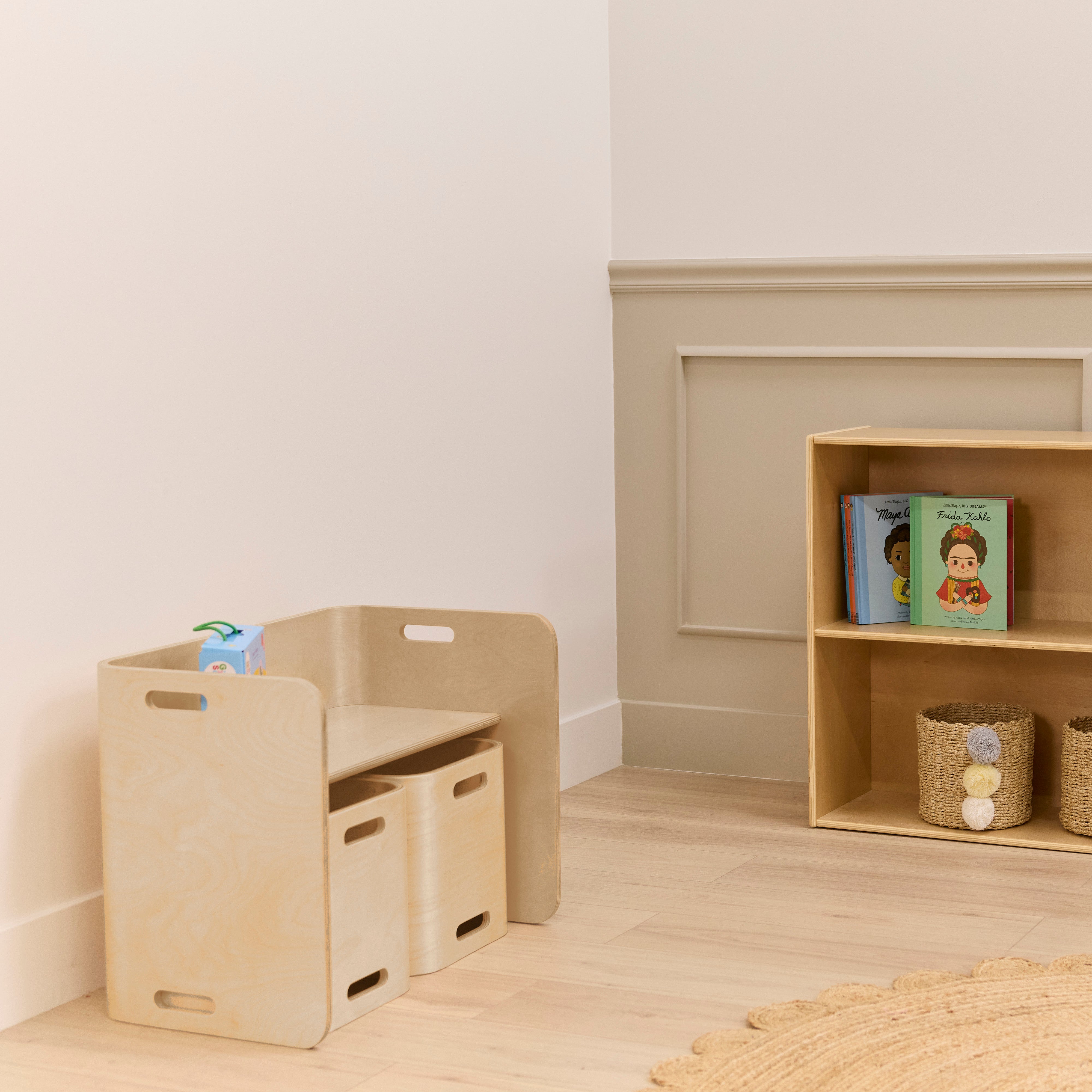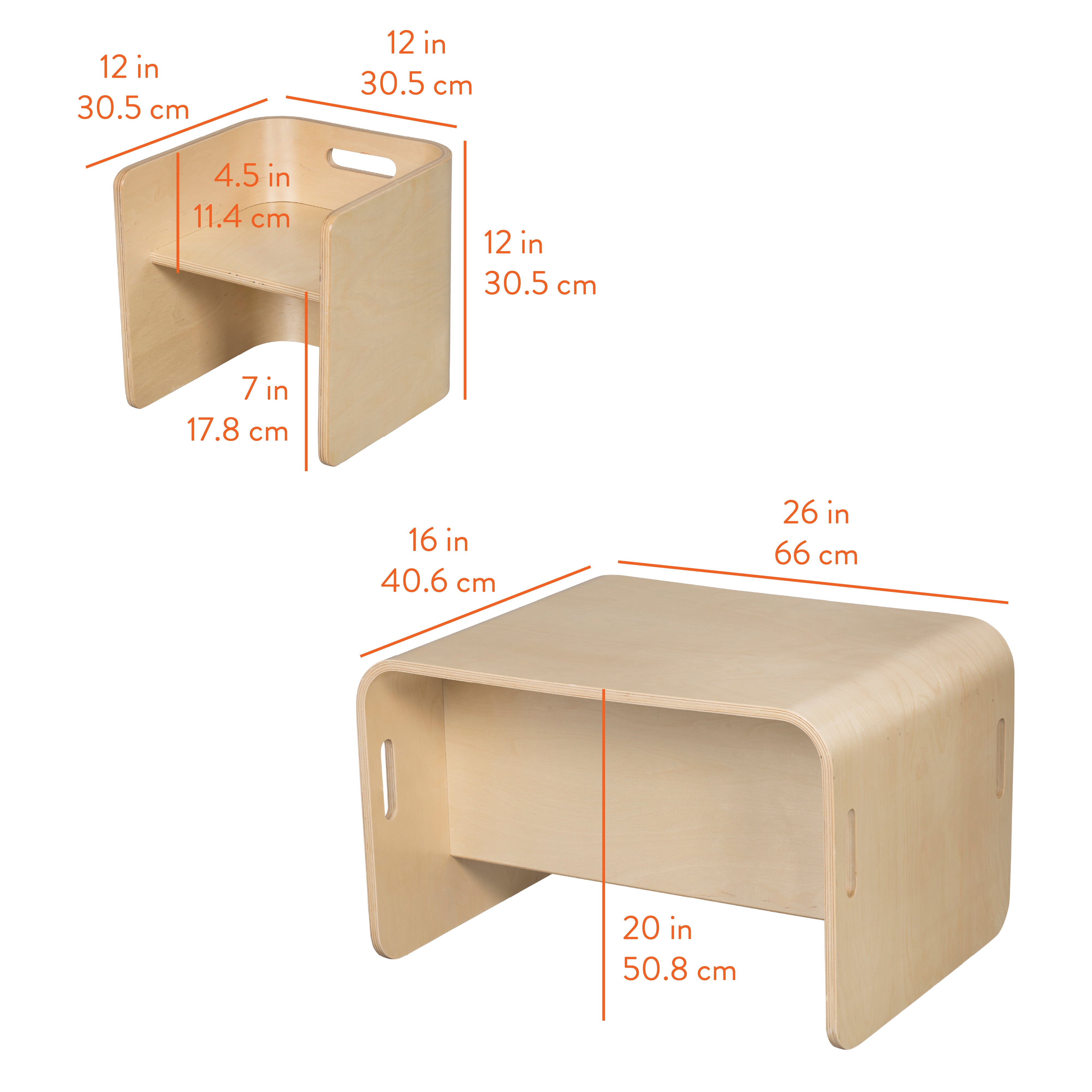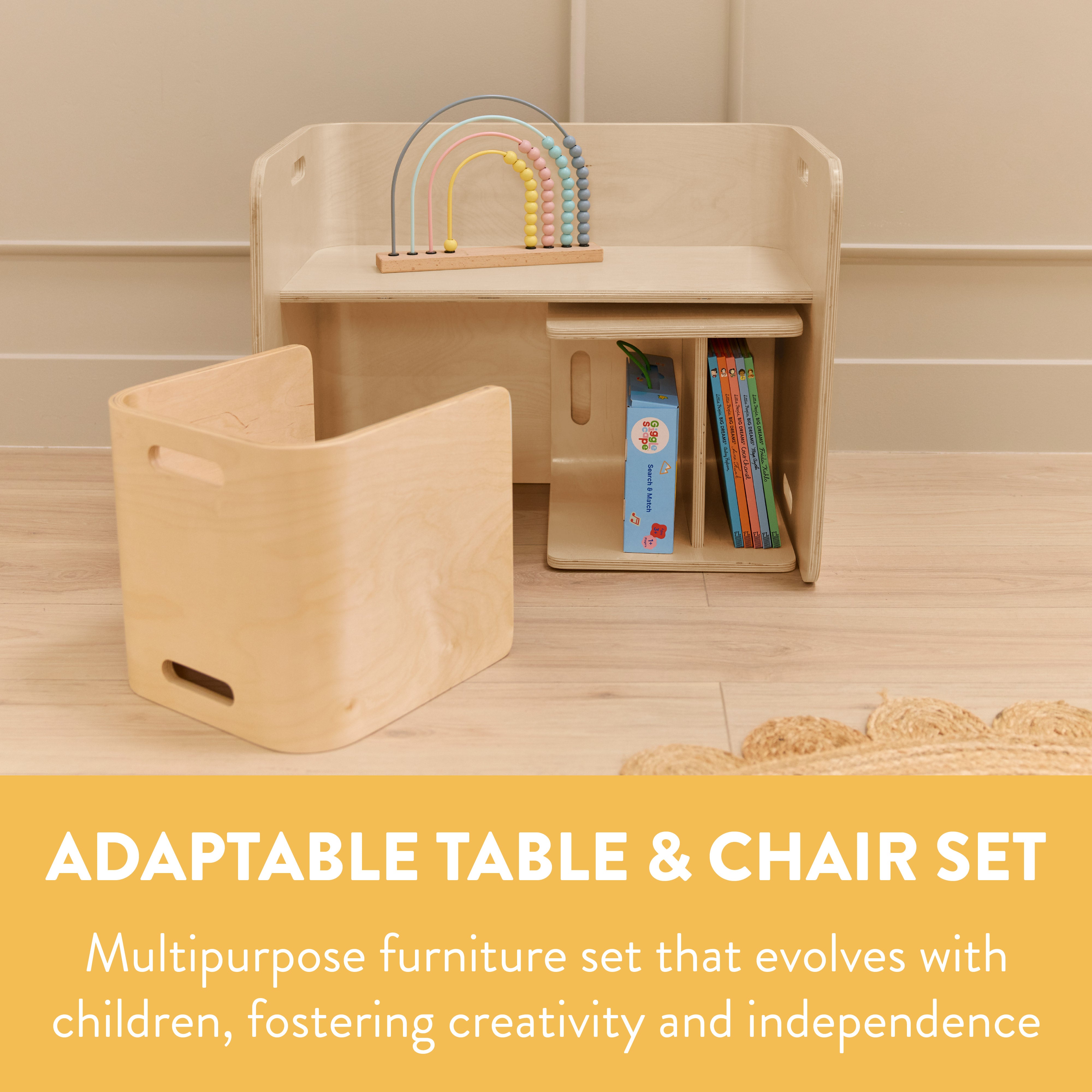 Create a flexible space that adapts to your child's needs with the Back2School Express Bentwood Adaptable Kids Table and Chairs Set, a stylish, space-saving solution ideal for the home, playroom, or classroom. This modern toddler table and chair set includes two adaptable chairs with dual seat heights, designed to support your child as they grow. Curved toddler chair backs encourage healthy posture and provide comfortable support during seated activities, helping little ones stay focused. Lightweight with built-in handles, each kids chair is easy for little ones to move independently, offering mobility and support during play or learning. This multi-functional set doubles as a toddler activity table, homework station, or creative corner. Crafted from sustainably sourced birch plywood that is shaped into a kids table and chair set that features a durable, scratch-resistant finish that protects the wood surface from daily wear. A UV inhibitor helps prevent discoloration for long-lasting quality. Strong and sturdy, the natural birch plywood construction is designed to withstand everyday use in a busy home and daycare environment. This versatile set works as a small table and chairs set, a kid’s desk, or a toddler desk—adapting to your child’s needs as they grow.